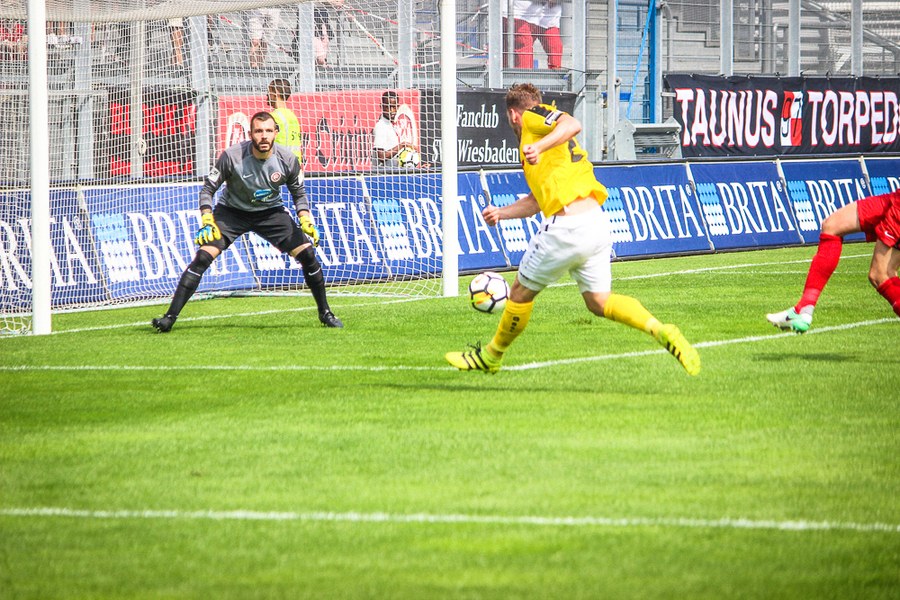In der Anfangsphase der Partie tasteten sich beide Mannschaften zunächst einmal ab. Das Spiel fand hauptsächlich im Mittelfeld statt, wobei die Wiesbadener versuchten, früh das Heft des Handelns in die Hand zu nehmen. Die ersten Versuche von Schäffler (5.) und Andrich (8.) stellten Boss aber vor keine große Probleme. Kurz darauf war es Robin Scheu, der mit einem Kopfball (9.) die erste Chance für die Fortuna hatte. In der Folge bestimmten lange Bälle das Spielgeschehen, wobei die Fortuna defensiv äußerst souverän agierte. Kegel versuchte immer wieder die Anspiele auf die schnellen Außen Farrona Pulido und Scheu, was in der 18. Minute gelang: Scheu tauchte im Strafraum unter Bedrängnis vor Kolke auf. Der Torhüter der Wiesbadener konnte die erste wirkliche Chance der Partie aber parieren. Auf der anderen Seite war es wenige Minuten später Boss, der bei einem Versuch von Müller aus kurzer Distanz seine ganze Klasse zeigen musste (24.). Kurz vor der Pause gab es dann die bis dato größte Doppelchance für die Gastgeber. Ruprecht und Dams trafen nach einer Ecke aber jeweils nur das Aluminium (42.). So ging es für beide Mannschaften torlos in die Kabinen.