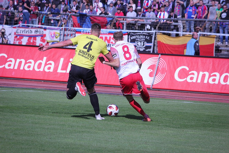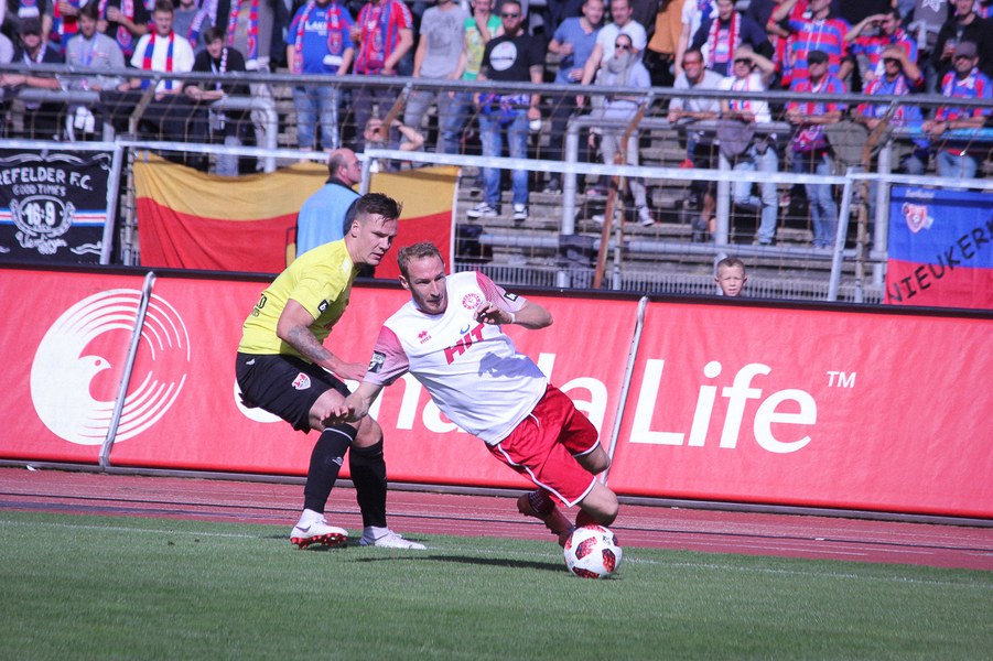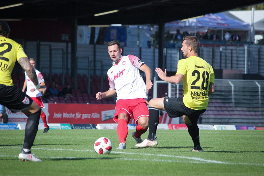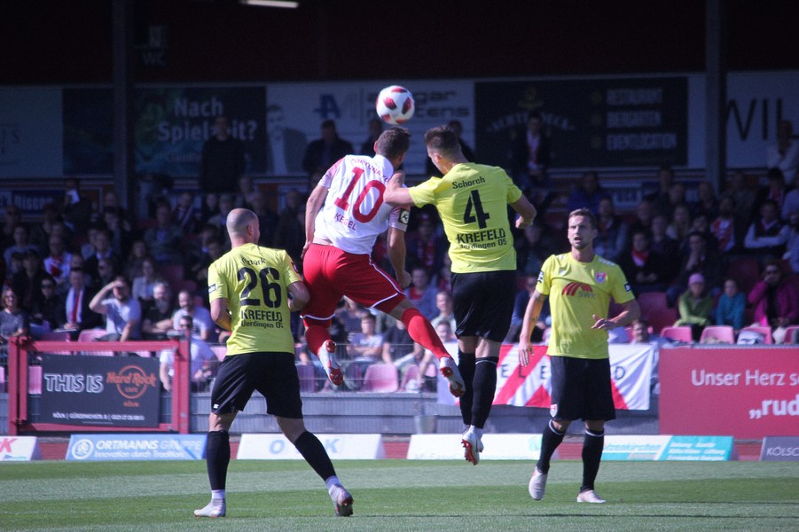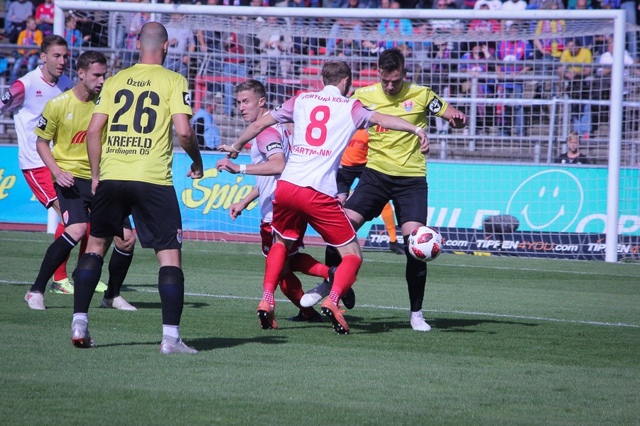 Nachdem beide Mannschaften in der englischen Woche Negativerlebnisse verarbeiten mussten, entwickelte sich im Südstadion früh ein munteres Spiel. Uerdingen suchte mit Dreierkette sein Heil direkt in der Offensive und tauchte über Krempicki direkt gefährlich vor Rehnen auf (3.). Die Fortuna meldete sich ihrerseits nach einer Ecke mit einem Abschluss von Scheu an (7.). Nach einer ausgeglichenen Anfangsphase bekam die Koschinat-Elf das Spiel besser in den Griff. So schaffe man es, die beiden Offensivspieler Aigner und Kefkir aus dem Spiel zu nehmen und früh den Ball zu gewinnen. Ein weiterer Abschluss von Scheu nach Ablage von Hartmann war die Konsequenz (20.). Anschließend gönnte sich das Spiel jedoch eine Verschnaufpause. Es entwickelte sich vor allem ein Abnutzungskampf im Zentrum. Beide lauerten auf Fehler des anderen. So blieb es lange bei einem harmlosen Distanzschuss von Aigner für Krefeld (34.). Auch wenn beide Mannschaften noch einmal offensiv einen Gang nach oben schalteten, sollte nichts mehr vor den Toren passieren. Vielmehr sorgte eine Verletzung für den traurigen Schlusspunkt: Kurz vor dem Pausentee musste Uerdingens Kapitän Erb mit Verdacht auf Kreuzbandriss raus. Mit dieser Hiobsbotschaft ging es in die Kabine.