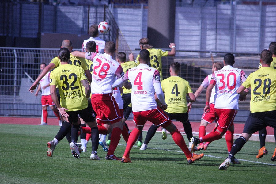 Nach dem Wiederanpfiff nahm das Spiel zunächst nur langsam Tempo auf. Uerdingen stellte durch die Einwechslung von Litka auf eine Viererkette um. Es sollte auf beiden Seiten aber vor den Toren nichts Nennenswertes passieren. Nach einer guten Stunde blitzte dann die individuelle Qualität von Uerdingen auf: Dorda hebelte mit einem langen Ball die Kölner Defensive aus, sodass Aigner alleine vor Rehnen auftauchte und durch die Beine des Kölner Keepers zur KFC-Führung vollendete (62.). Das Gegentor schockte das Südstadion und Uerdingen setzte noch einen drauf: Einen Freistoß aus 25 Metern hob Kefkir mit Schnitt über die Mauer und unhaltbar für Rehnen zum 0:2 in die Maschen (68.). Die Fortuna versuchte auf den schockartigen Doppelschlag zu reagieren, indem Dahmani aus der zweiten Reihe abzog (71.) Kurz darauf hatte der Fortuna-Kapitän nach einem Kegel-Freistoß die beste Chance zum Anschluss, als er aus kurzer Distanz direkt abschloss, aber auf Vollath zielte (74.). Die Fortuna mühte sich, aber das ganz große Aufbäumen bleib zunächst aus. Ein Abschluss von Eberwein läutete schließlich die Schlussphase ein (81.). Mit der Einwechslung von Kyere drängte die Fortuna noch weiter auf den Anschlusstreffer. Der ebenfalls zuvor eingewechselte Andersen verkürzte dann aus rund 18 Metern (93.). Es sollte jedoch beim 1:2 verbleiben, nachdem kurz vor Ende Dahmani aus zentraler Position im Strafraum noch einmal an Vollath scheiterte (94.). So ging die Fortuna am Ende der englischen Woche erneut leer aus.