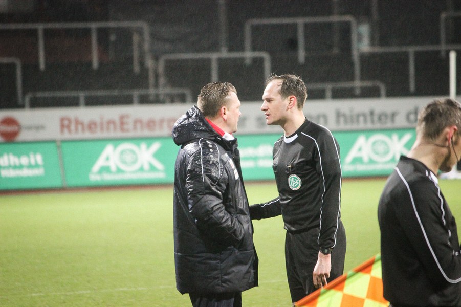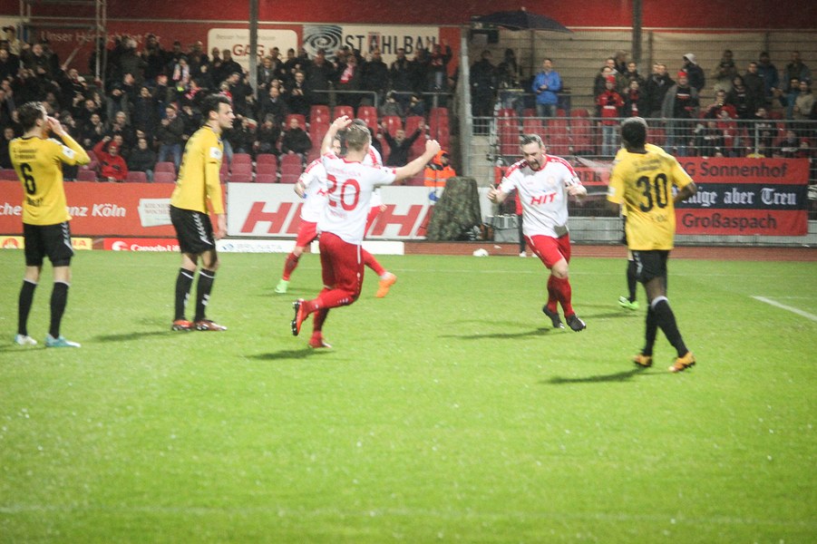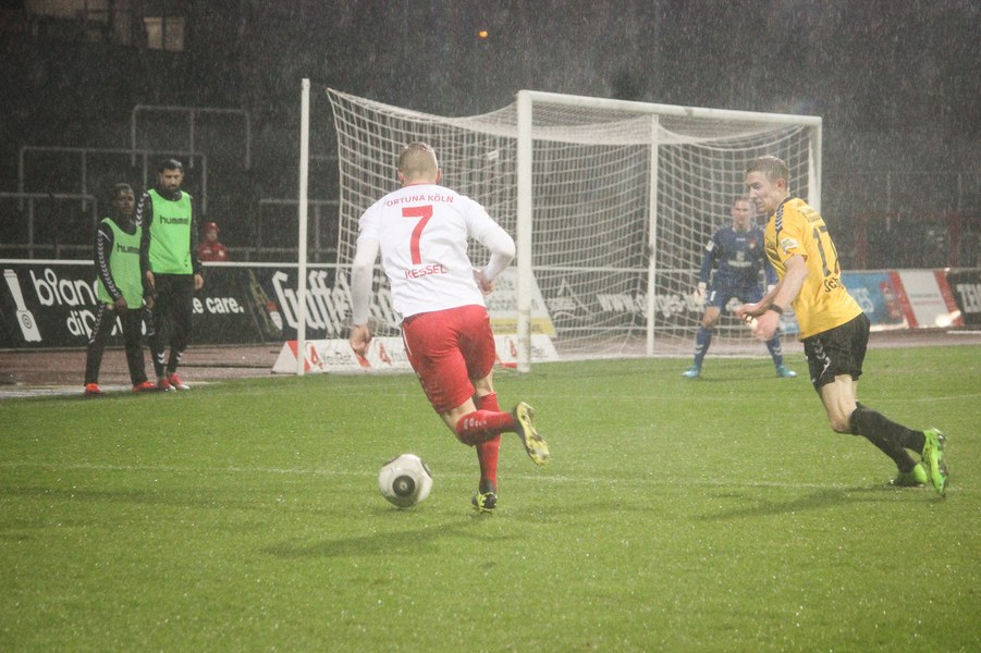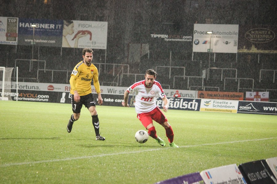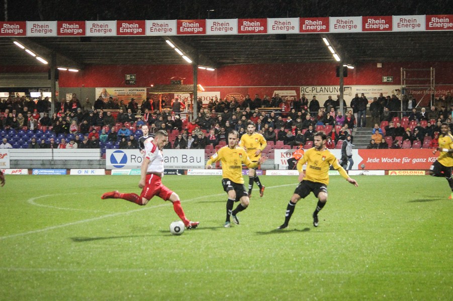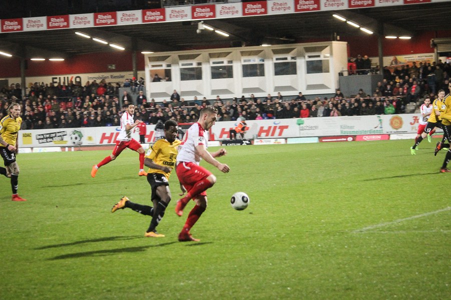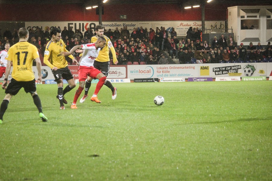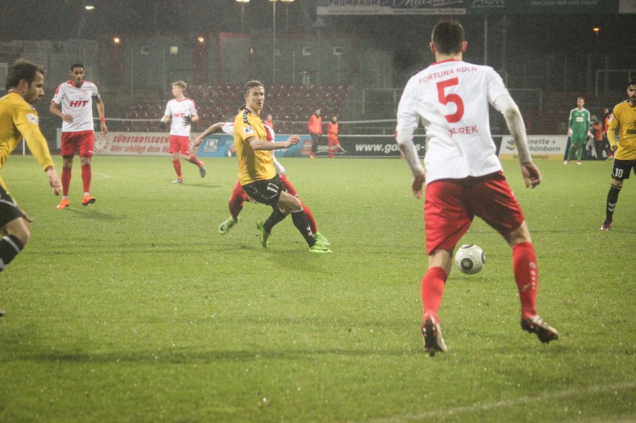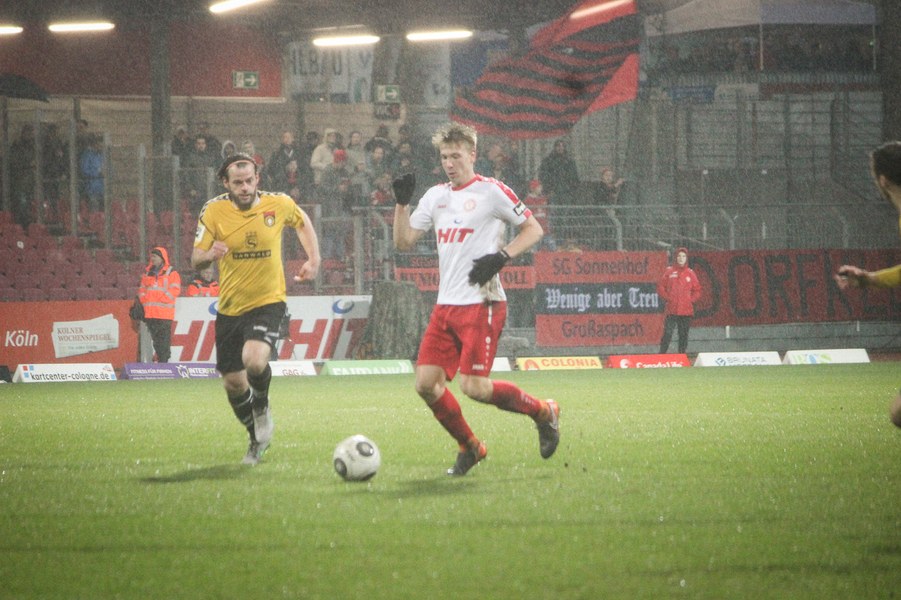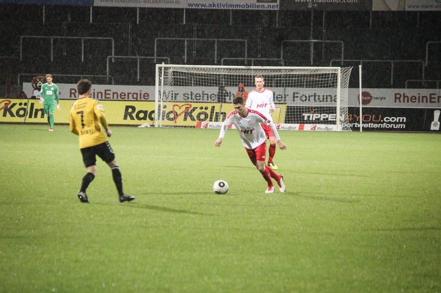 Die SG Sonnenhof Großaspach konnte in der Rückrunde noch kein Spiel für sich entscheiden. Den daraus resultierenden Frust konnte man den Schwaben in der Anfangsphase anmerken. Sie griffen die Kölner früh an und provozierten Fehler. In den Anfangsminuten trug dieses Pressing bereits Früchte: Boss wollte das Spiel über Brandenburger aufbauen. Fountas lauerte auf diesen Pass, ging entschieden dazwischen und konnte den Ball erobern. Schließlich überlupfte er den Kölner Schlussmann zur Gäste-Führung (3.). In der Folgezeit liefen die Spieler der SG immer wieder entschlossen an. Die Fortuna brauchte etwas, um ins Spiel zu finden, erhöhte aber zusehends den Druck und kam dem schwäbischen Tor näher. So erspielte man sich ein optisches Übergewicht. Nach einer Hereingabe von Farrona Pulido setzte Dahmani zum Flugkopfball an, der Ball ging aber knapp vorbei (26.). Schließlich konnten die Kölner durch eigenes Pressing den Ball erobern und sofort umschalten: Scheu gewann den Ball in der Hälfte der Gäste und spielte nach Doppelpass mit Ernst Kegel frei, der überlegt zum 1:1 einschob (30.). Kurz darauf hatte Brandenburger die Führung auf den Kopf, Broll konnte seinen Versuch aber parieren (35.). Die SG Sonnenhof Großaspach war zu der Phase eigentlich nicht im Spiel und schlug dann doch eiskalt zu: Nach einem langen Ball tauchte Gyau frei vor Boss auf und erzielte eiskalt das 2:1 für die Gäste (43). So gingen die Schwaben mit einer Führung in die Pause.