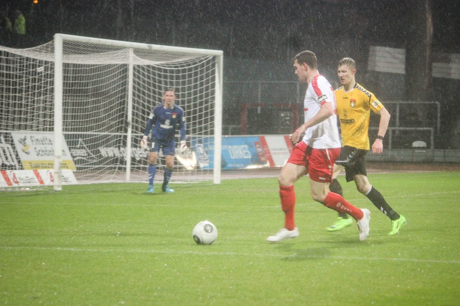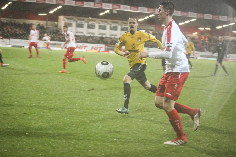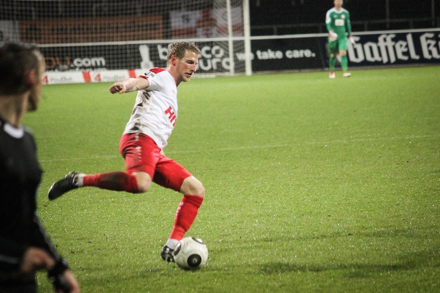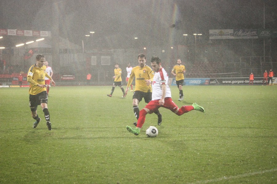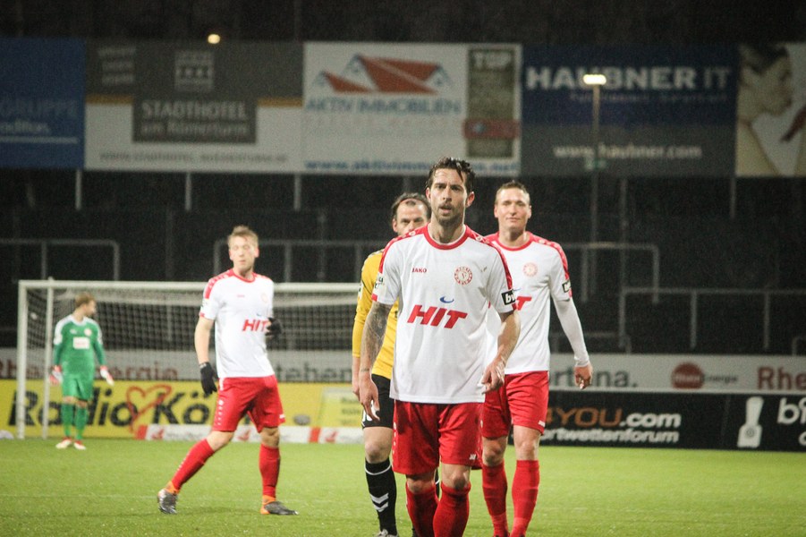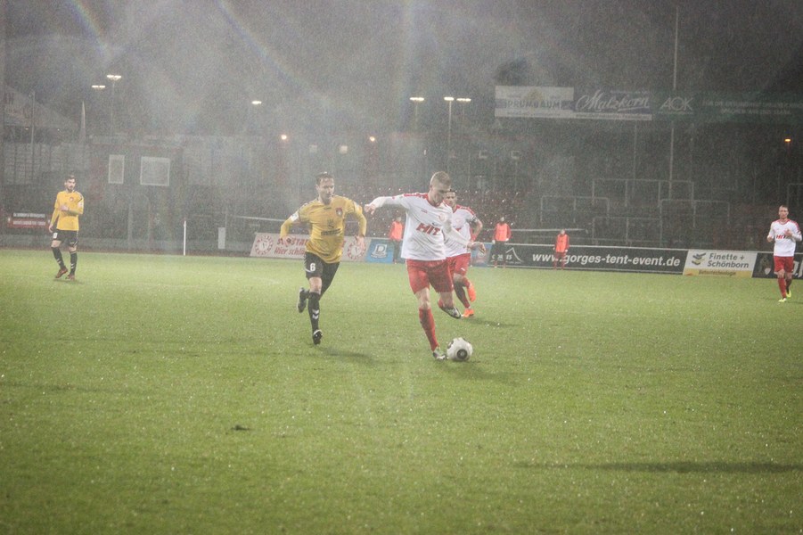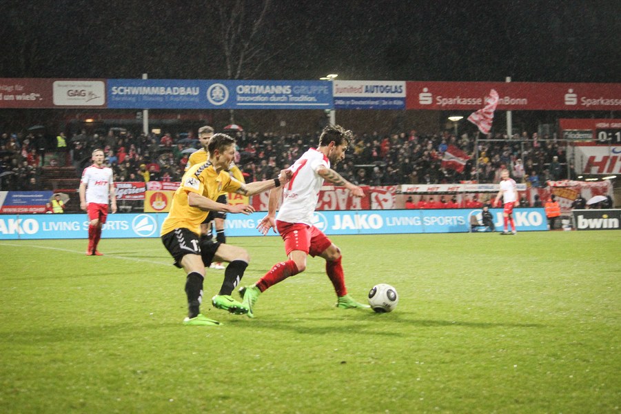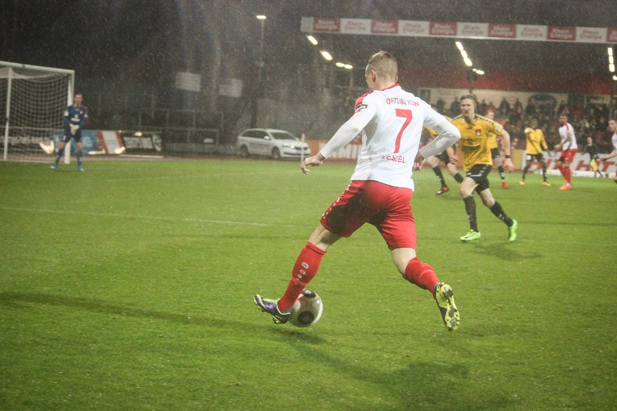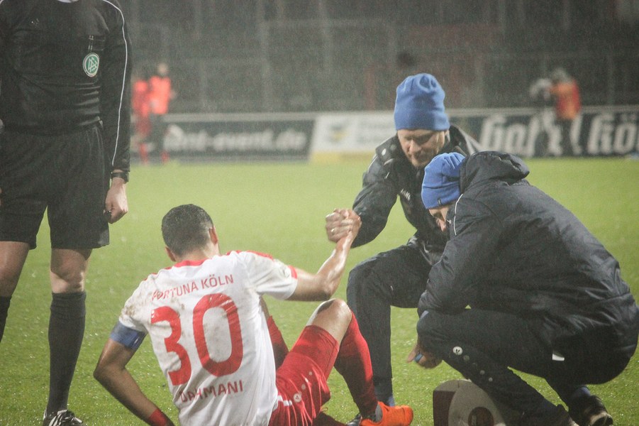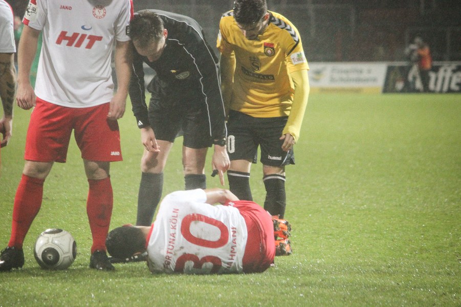Die SG Sonnenhof Großaspach konnte in der Rückrunde noch kein Spiel für sich entscheiden. Den daraus resultierenden Frust konnte man den Schwaben in der Anfangsphase anmerken. Sie griffen die Kölner früh an und provozierten Fehler. In den Anfangsminuten trug dieses Pressing bereits Früchte: Boss wollte das Spiel über Brandenburger aufbauen. Fountas lauerte auf diesen Pass, ging entschieden dazwischen und konnte den Ball erobern. Schließlich überlupfte er den Kölner Schlussmann zur Gäste-Führung (3.). In der Folgezeit liefen die Spieler der SG immer wieder entschlossen an. Die Fortuna brauchte etwas, um ins Spiel zu finden, erhöhte aber zusehends den Druck und kam dem schwäbischen Tor näher. So erspielte man sich ein optisches Übergewicht. Nach einer Hereingabe von Farrona Pulido setzte Dahmani zum Flugkopfball an, der Ball ging aber knapp vorbei (26.). Schließlich konnten die Kölner durch eigenes Pressing den Ball erobern und sofort umschalten: Scheu gewann den Ball in der Hälfte der Gäste und spielte nach Doppelpass mit Ernst Kegel frei, der überlegt zum 1:1 einschob (30.). Kurz darauf hatte Brandenburger die Führung auf den Kopf, Broll konnte seinen Versuch aber parieren (35.). Die SG Sonnenhof Großaspach war zu der Phase eigentlich nicht im Spiel und schlug dann doch eiskalt zu: Nach einem langen Ball tauchte Gyau frei vor Boss auf und erzielte eiskalt das 2:1 für die Gäste (43). So gingen die Schwaben mit einer Führung in die Pause.