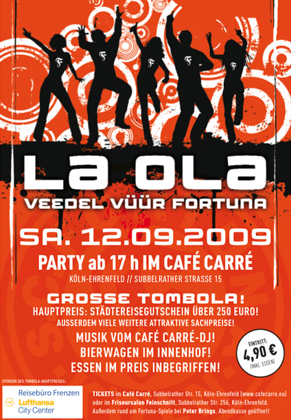 Am Wochenende findet kein Spiel der Fortuna statt. Zeit genug also, die große LaOla-Party im Café Carré in Köln-Ehrenfeld zu besuchen. Organisiert von Fortuna-Fans für Fortuna-Fans. Der Eintritt kostet nur € 4,90.