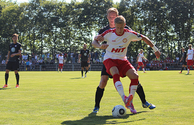 Knapp 200 Zuschauer bekamen dabei auf dem Platz im Schulzentrum Weiden/Köln von Beginn an ein zerfahrenes Testspiel zu sehen. Dabei zeigte sich Hessen Kassel in der Anfangsviertelstunde aktiver, ohne aber echte Torgefahr auszustrahlen. Vielmehr war es die Fortuna, die durch einen Distanzschuss von Serdar den ersten gefährlichen Abschluss verbuchte (14.). Beide Teams konzentrierten sich aber zunächst auf die eigenen Defensivaufgaben. Die eigenen Angriffsbemühungen endeten auf beiden Seiten spätestens vor den gegnerischen Strafräumen. Dabei bekamen beide Teams die letzte Intensität in der Offensive nicht auf den Platz. So waren es ein schnell ausgeführter Freistoß von Pazurek (23.) und ein Freistoß von Biada in Nähe des Strafraums (29.), die ansatzweise für Gefahr sorgten. Nach einer halben Stunde hatte jedoch Bektasi für Kassel die Führung auf dem Fuß, nachdem er nach einem Laufduell gegen Schneider den Ball über Poggenborg, aber auch über das Kölner Tor hob (30.). Etwas aus dem Nichts markierte schließlich Biada mit einer sehenswerten Einzelaktion die Führung für die Koschinat-Elf: Dabei ließ der Stürmer zwei Verteidiger stehen und zeigte sich vor dem Schlussmann der Hessen eiskalt (33.).