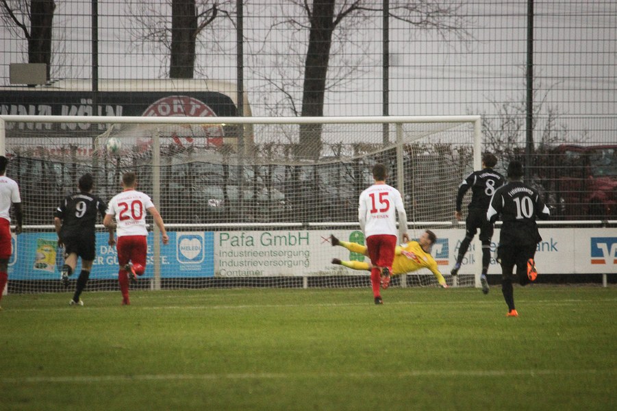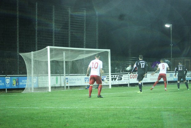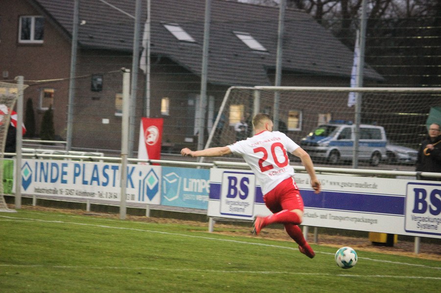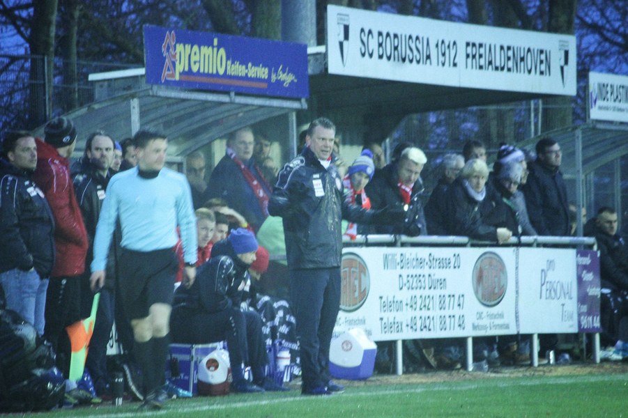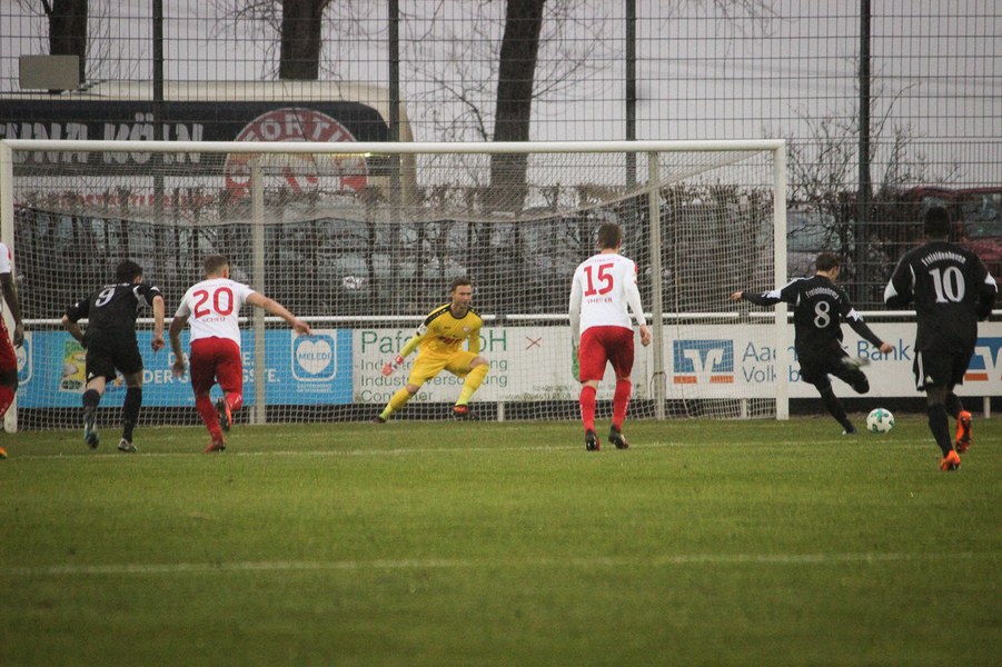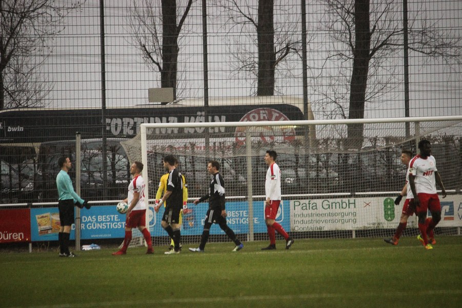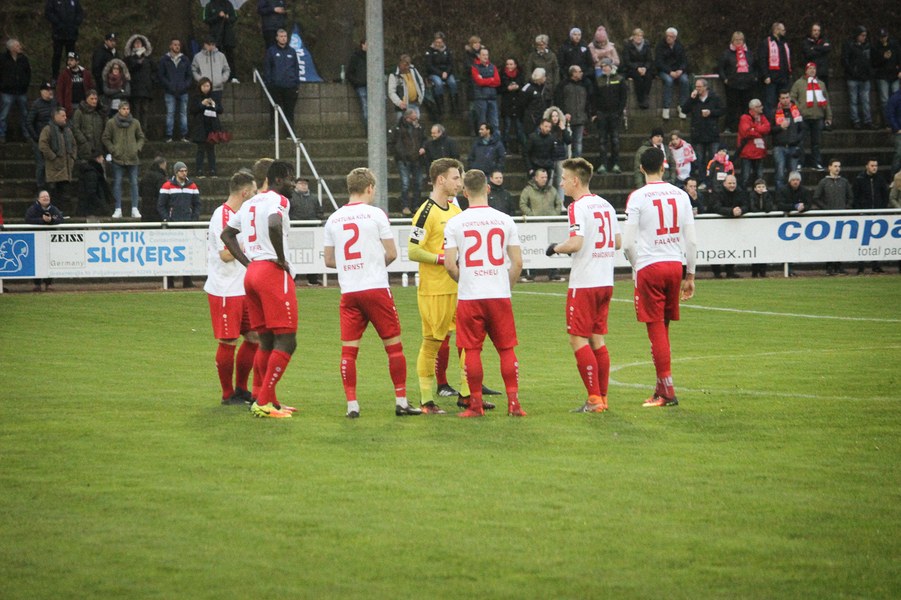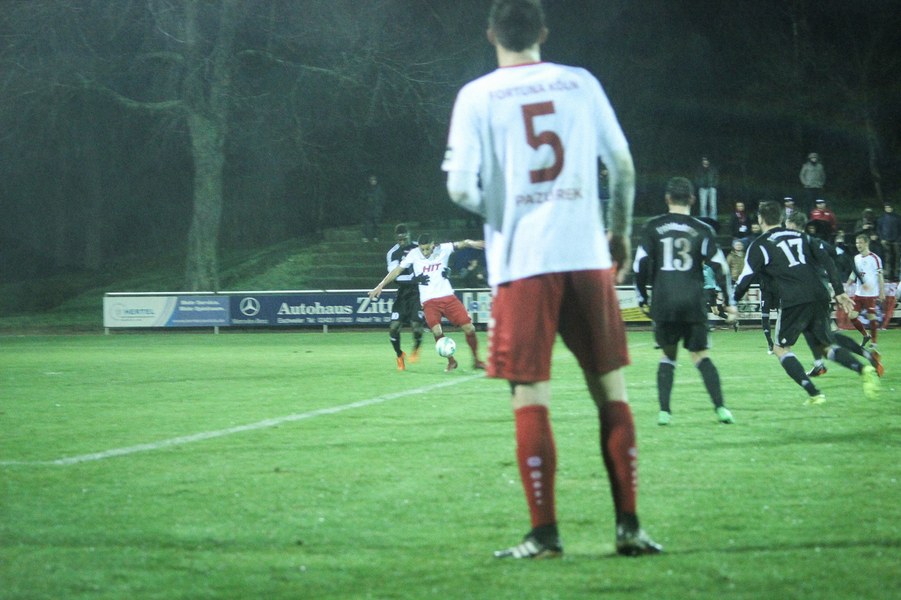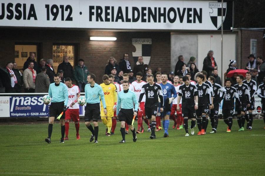 Für Borussia Freialdenhoven war es das absolute Highlightspiel, was man auch merkte. Die Hausherren liefen in der Anfangsphase früh an und lauerten auf Fehler der Kölner. Der Plan von Freialdenhoven ging dabei früh auf: Nico Brandenburger foulte Daescu im Strafraum, es gab Elfmeter. Simon verwandelte den Strafstoß mit Gewalt sicher in der Mitte (8.). Die Fortuna hatte am frühen Gegentreffer durchaus zu knabbern: Simon setzte sich gegen seine Gegenspieler durch. Sein Distanzschuss ging jedoch am Tor vorbei (16.). Erst Mitte der ersten Halbzeit kamen die Kölner besser in die Partie. Farrona Pulido zog aus 25 Metern ab und Werres im Tor von Freialdenhoven musste sich ganz lang machen (19.). Die beste Phase hatten die Gäste 20 Minuten vor Pausenpfiff. Als erstes wurde Kegels Schuss kurz vor der Linie abgeblockt (32.). Die nächste Riesenchance ließ danach nicht lange auf sich warten: Brandenburger zog aus der Distanz ab und traf die Latte, der Nachschuss von Scheu ging knapp am Tor vorbei (35.). Die Fortuna konnte vor der Pause nur noch einmal durch einen Freistoß von Kegel gefährlich werden, der knapp am Tor vrobei ging (44.). So ging es mit einer letztlich glücklichen Führung für Borussia Freialdenhoven in die Pause.