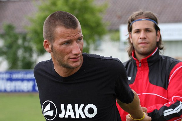 (Der noch verletzte Ioannis Foukis hilft Stürmer Cengiz Can bei den obligatorischen Dehnübungen, Foto: S.Flügel)
