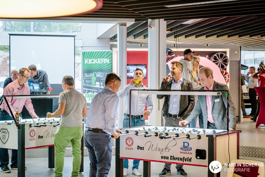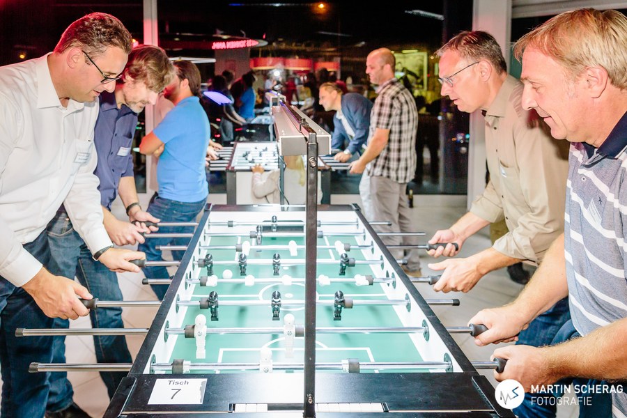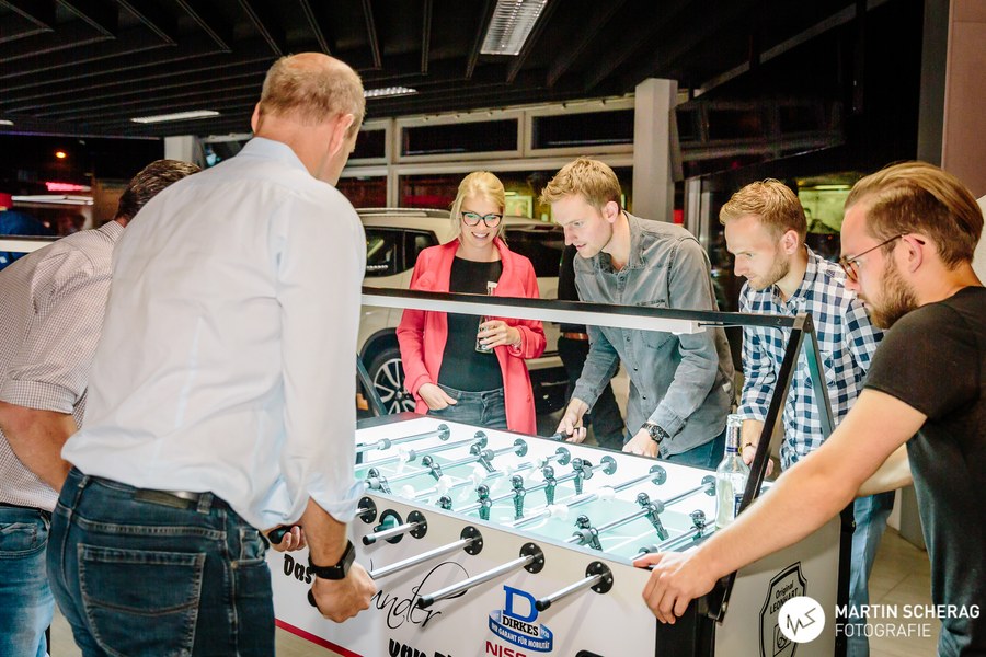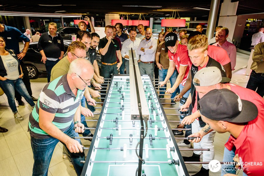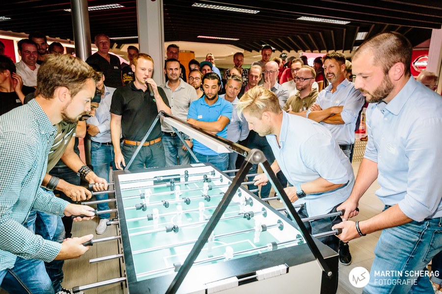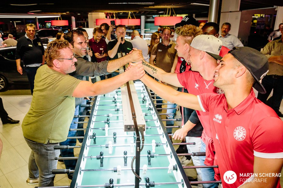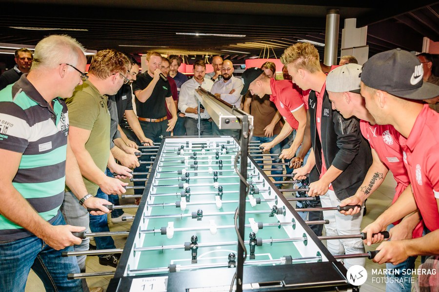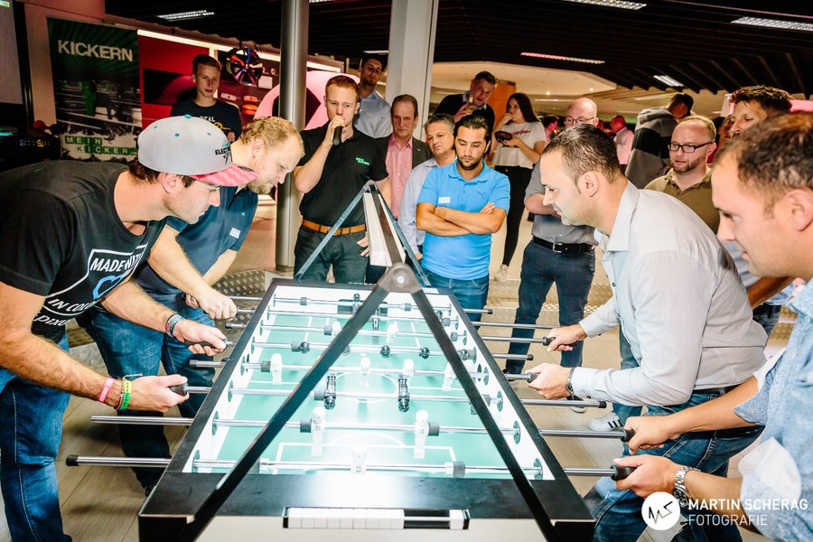 Zum vierten Mal bat die Fortuna die Partnerunternehmen zum Tischfußball. Zum dritten Mal in Folge fand die Veranstaltungen im Showroom des Autohaus Dirkes statt. An insgesamt elf Kicker-Tischen spielten insgesamt 44 Mannschaften um zwei Championsleague-Tickets für die Partie Borussia Dortmund gegen Atlético Madrid.
