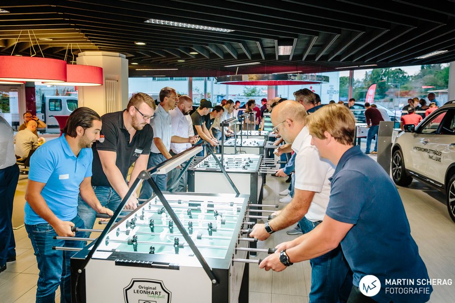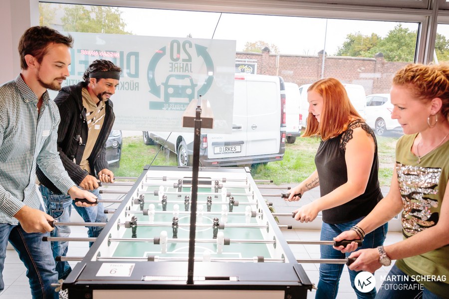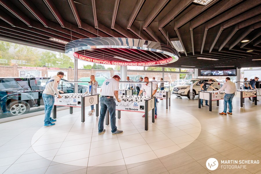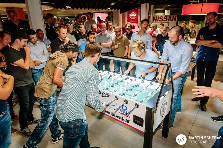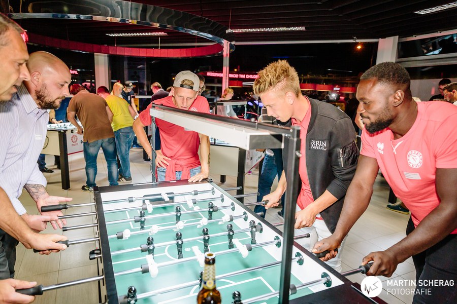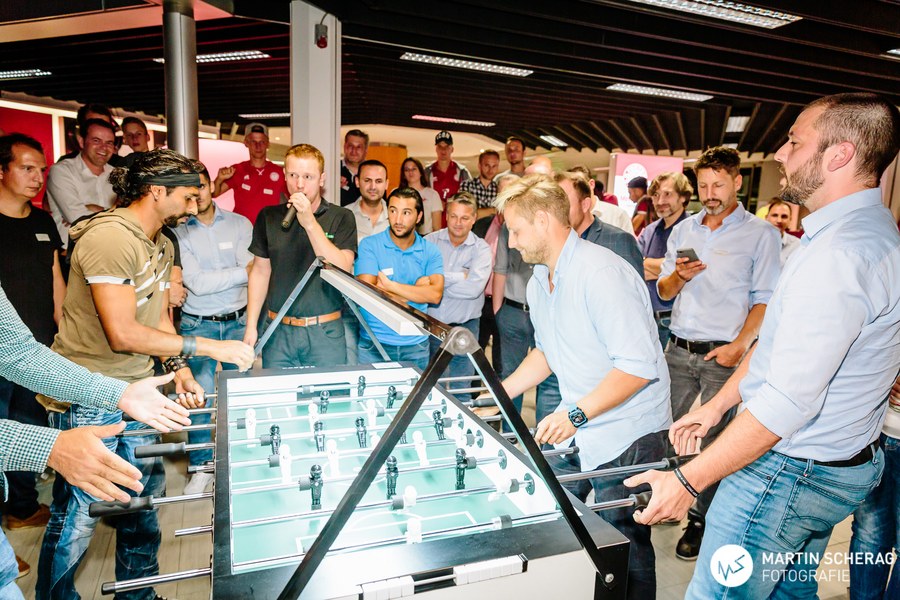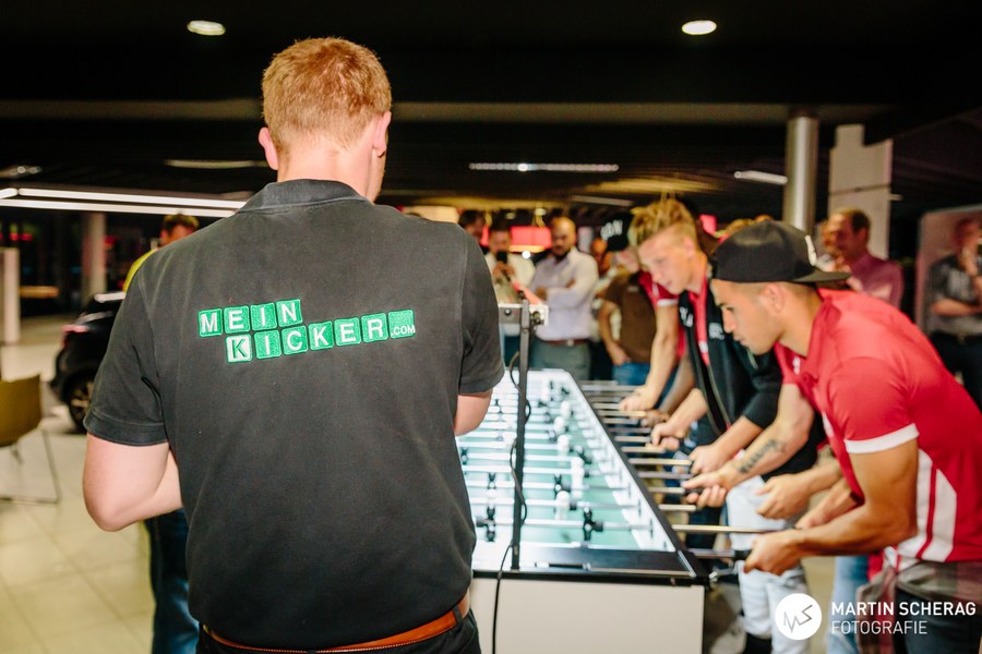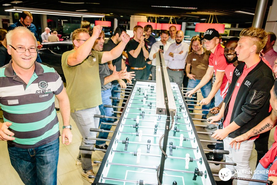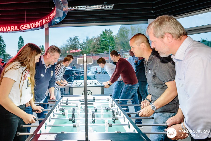Zum vierten Mal bat die Fortuna die Partnerunternehmen zum Tischfußball. Zum dritten Mal in Folge fand die Veranstaltungen im Showroom des Autohaus Dirkes statt. An insgesamt elf Kicker-Tischen spielten insgesamt 44 Mannschaften um zwei Championsleague-Tickets für die Partie Borussia Dortmund gegen Atlético Madrid.