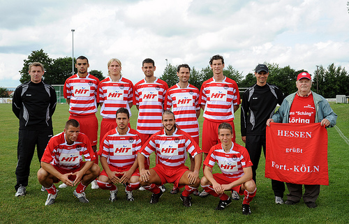 Vor dem Freundschaftsspiel gegen den TSV 1920 Geismar gruppierten sich die Neuzugänge 2009/2010 zum ersten gemeinsamen Bild. Hintere Reihe von links: Co-Trainer Rüdiger Hoppe, Zami Khalil, Tomas Tomanek, Benjamin Venekamp, Alexander Ende, Lars Marten, Trainer Matthias Mink, Manfred Schuppener (Fortuna-Fan aus Hessen). Vordere Reihe von links: Cengiz Can, Tevfik Furucu, Mario Schwarz, Abdelkader Maouel. Es fehlt Nuno Sanches, der aufgrund einer Kahnbeinverletzung nicht am Trainingslager teilgenommen hat (Foto: B. Lehmann)