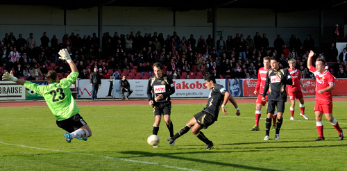 (Hamdi Dahmani erzielt die 1:0-Führung, nachdem er kurz zuvor einen Foulelfmeter verschossen hat, Foto: Gert König)