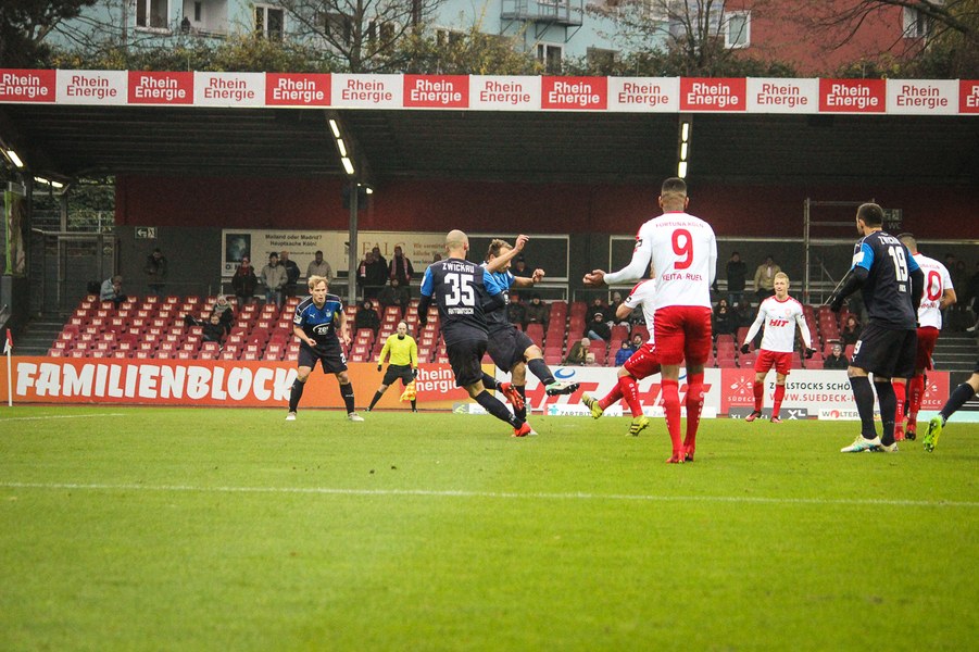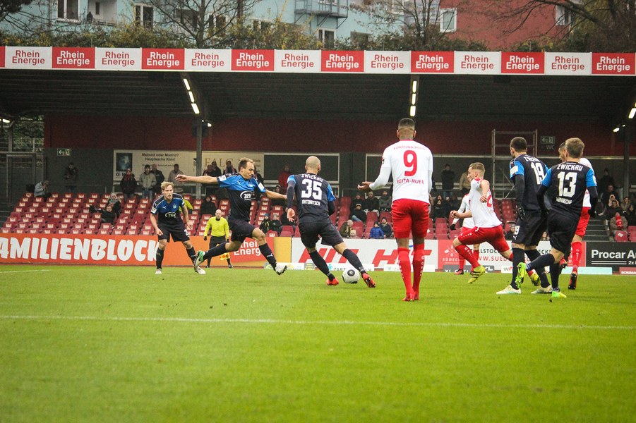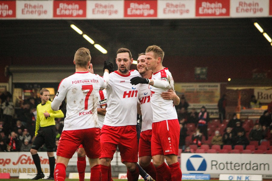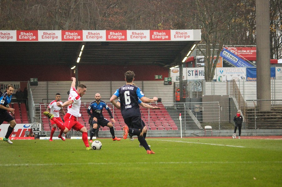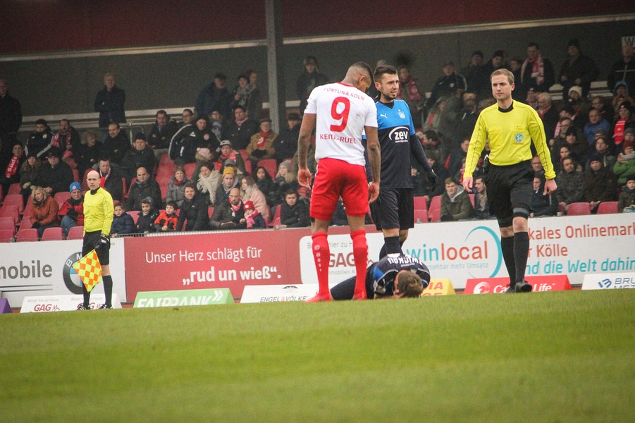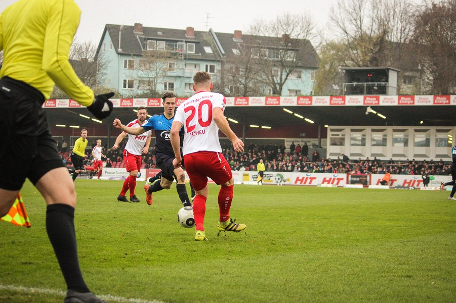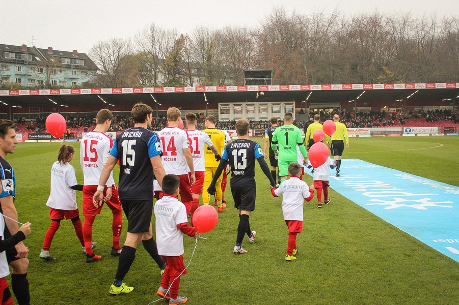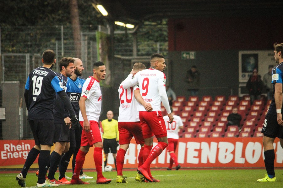Das Spiel begann zunächst schleppend. Bis auf Distanzschüsse von Kessel und Garbuschweski passierte offensiv zunächst wenig (2./4.). Beiden Teams waren die Negativerlebnisse der letzten Wochen anzumerken. So wollte man zunächst Sicherheit in seine Aktionen bekommen. Die Folge waren viele Aktionen zwischen den Strafräumen mit wenig ansehnlichen Kombinationen. Erst Mitte der ersten Halbzeit meldet sich die Fortuna spielersich an, als Kegel auf Scheu ablegte und der Brinkies zur Parade zwang (22.). Die neugeformte Kölner Viererkette um Ernst, Bender, Theisen und Röcker zeigte sich defensiv gegen Zwickaus König zumindest sattelfest. Nach einem Konter über Röcker und Keita-Ruel erarbeiteten sich die Südstädter über einen Kegel-Abschluss ein leichtes Chancenplus (30.). Schließlich schnupperte Theisen an der Fortuna-Führung, als er beinahe einen Kegel-Freistoß mit der Brust über die Linie bugsierte (32.). Schließlich belohnte Scheu eine stärker werdende Fortuna mit der Führung, als er nach cleverem Zuspiel von Kegel überlegt ins lange Eck einschob (36.). Kurz darauf verpasste der Mittelfeldakteur seinen Doppelpack, als er frei vor Brinkies nach einem Konter am Zwickau-Keeper scheiterte (42.). Auf der Gegenseite musste Boss kurz vor dem Pausentee sein ganzes Können aufbieten, als er dreimal in höchster Not gegen König und Kollegen parieren konnte (45.).