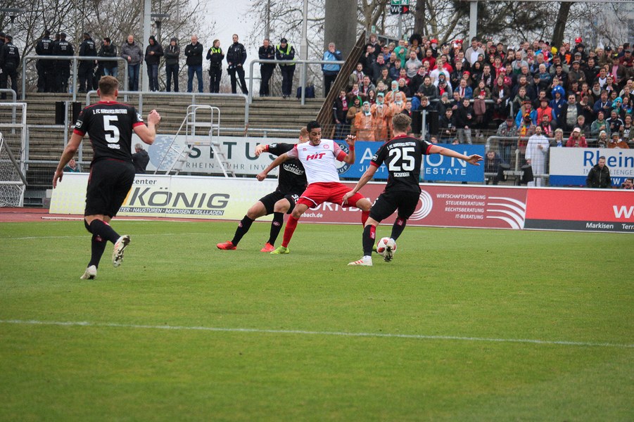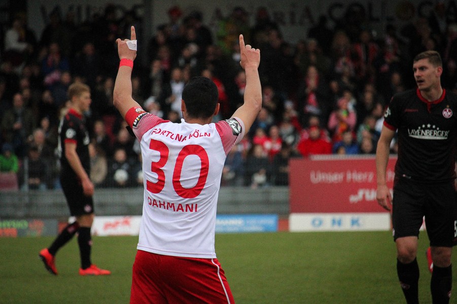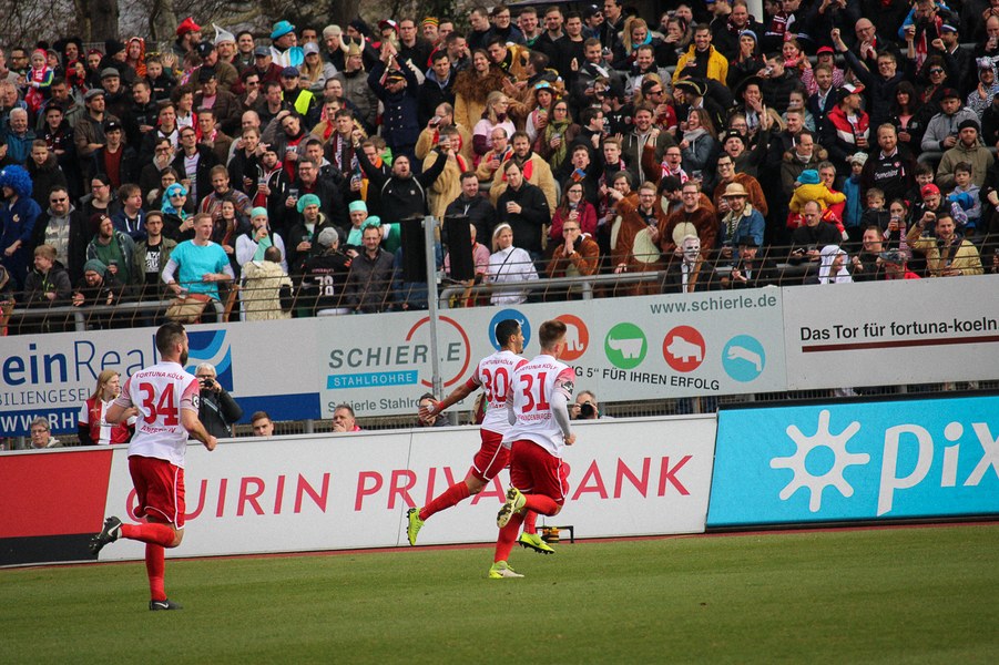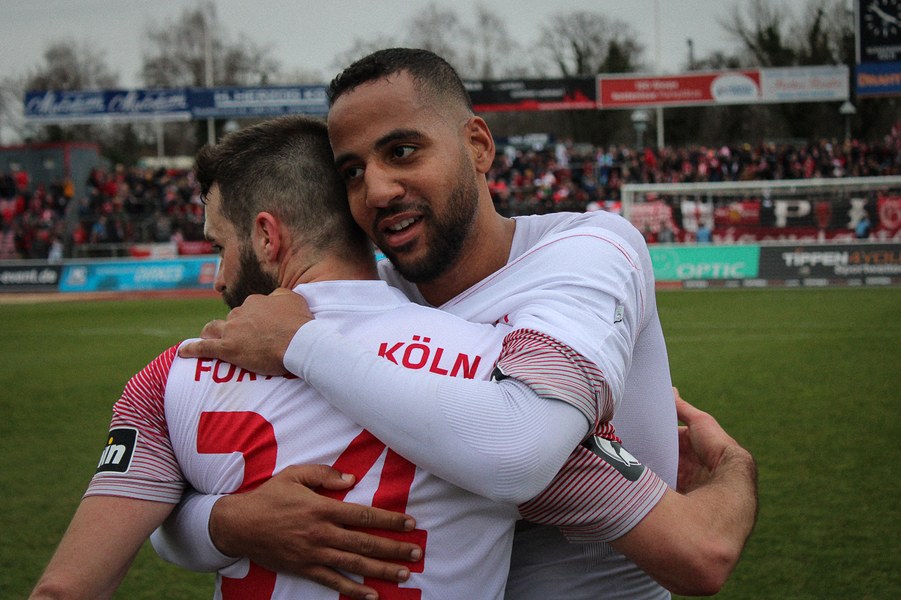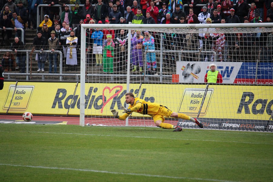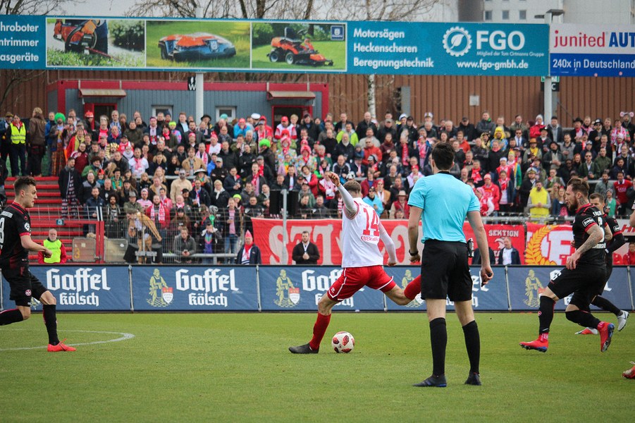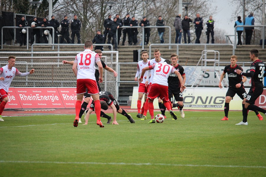 Fortuna Köln meldete sich gleich zu Beginn mit einer Doppelchance. Robin Scheu erkämpfte sich den Ball im Mittelfeld und spielte direkt in den Lauf von Hamdi Dahmani, der alleine auf Lennart Grill zulief. Der Kapitän scheiterte jedoch am ausgefahrenen Bein des Torhüters (2.). Nur eine Minute später ging Andersen über die linke Seite und spielte zurück an die Strafraumkante, an der Michael Eberwein lauerte, den Schuss aus der Distanz jedoch knapp neben den Pfosten setzte. In der 13 Spielminute machte Hamdi Dahmani es dann besser und versenkte den Ball nach Zuspiel von Michael Eberwein im langen Eck. Doch lange währte die Führung der Fortuna nicht. Christian Kühlwetter setzte zwei Minuten später die Uhren wieder auf Null und sorgte für den Ausgleich der Gäste. Es folgte ein offener Schlagabtausch im Kölner Südstadion, ehe ein Pfiff des Unparteiischen den Südstädtern einen Dämpfer verpasste. Schiedsrichter Florian Badstübner zeigte nach einem Foul an Kühlwetter auf den Punkt. Nikolai Rehnen war zwar noch am Ball, konnte aber nicht verhindern, dass der Schuss von Henrik Zuck hinter der Linie landete (27.). Das war aus Fortuna-Sicht bitter und kein Ergebnis, das den bisherigen Spielerlauf widerspiegelte. Auf der anderen Seite sorgte Andersen für den nächsten Abschluss der Fortuna. Nach einer Ecke zog er den Ball direkt auf das Tor, setzte das Spielgerät jedoch deutlich daneben. So ging es ohne weitere Tore in die Pause.