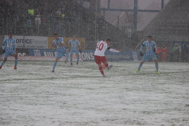 Die sollte aber zu Beginn der zweiten Halbzeit nicht allzu lange Bestand haben: Einen Freistoß vom Chemnitzer Kaffenberger verlängerte Andersen unglücklich ins eigene Netz (47.). Die CFC- Fans zeigten sich nach einem kurzen Torjubel aber auch weiterhin sparsam mit Unterstützung. Die Fortuna versuchte so den Rückschlag schnell wegzuschütteln und die anhaltende Verunsicherung an der Gellertstraße auszunutzen. So steckte Dahmani den Ball auf Souza durch, dessen Schuss Kunz aber entschärfen konnte (59.). Das Tor machten aber die Gastgeber: Nach einem erneuten Freistoß von Kaffenberger köpfte Danneberg den Ball unhaltbar für Poggenborg ins lange Eck (64.). Damit drehte Chemnitz die Partie. Die Fortuna hatte zwar mehr vom Spiel, fand auf dem schneebedeckten Platz aber zunächst keine Lösungen gegen einen nun kompakten CFC. Nach einem Freistoß von Souza wurde ein Schuss von Andersen geblockt (77.). Die Gastgeber sorgten mit Schüssen von Nandzik und Löning für Entlastung (79./81.). Schließlich sorgte Fink für die Entscheidung: Nach einem Freistoß tauchte der Rekordtorschütze der 3. Liga im Strafraum auf und verwandelte trocken zum 3:1 für den CFC (81.). Zwar hatte Königs kurz vor Schluss aus spitzem Winkel noch die Möglichkeit zu verkürzen (87.). Am Ende blieb es bei der 1:3-Niederlage der Fortuna in Chemnitz.