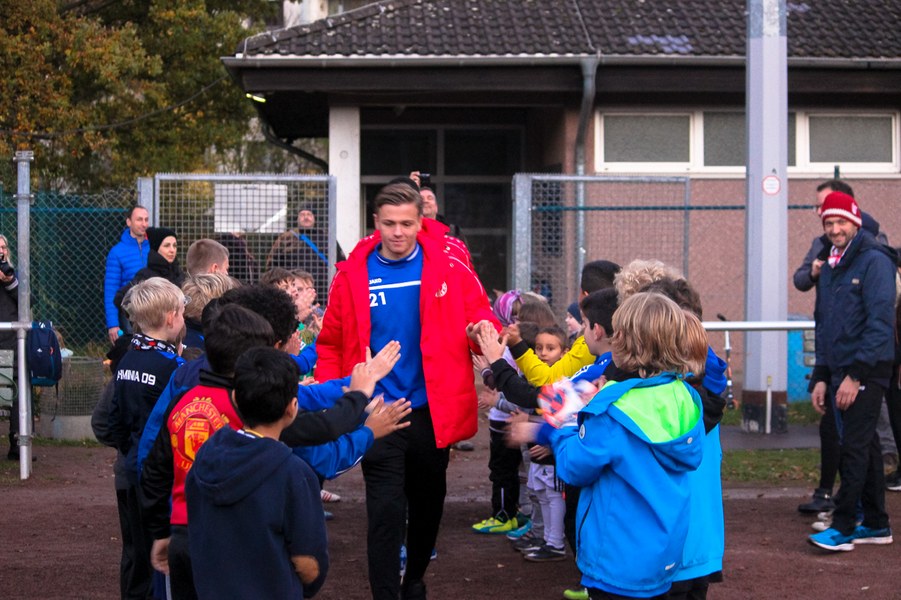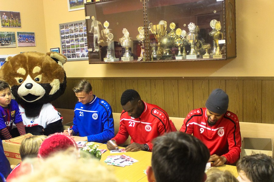 Nach dem Training ging es für beide Mannschaften rüber ins Vereinsheim. Dort hatten sie die Möglichkeit, den drei Fortunen ihre Fragen zu stellen, um so mehr über die Profifußballer zu erfahren. So durfte Keita-Ruel unter anderem über seine bisherigen Saisontore reden. Abschließend wurden noch fleißig Autogramme geschrieben und Fotos gemacht.