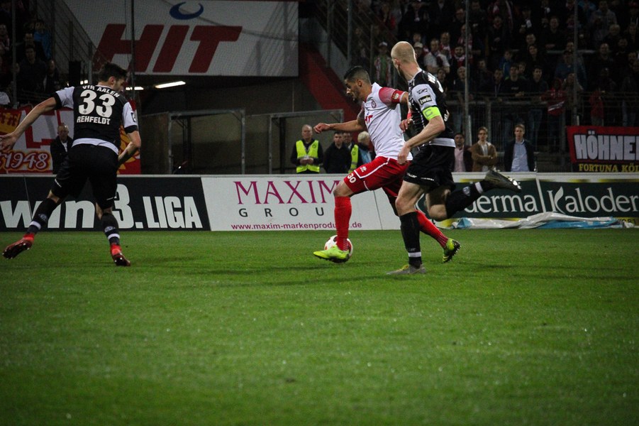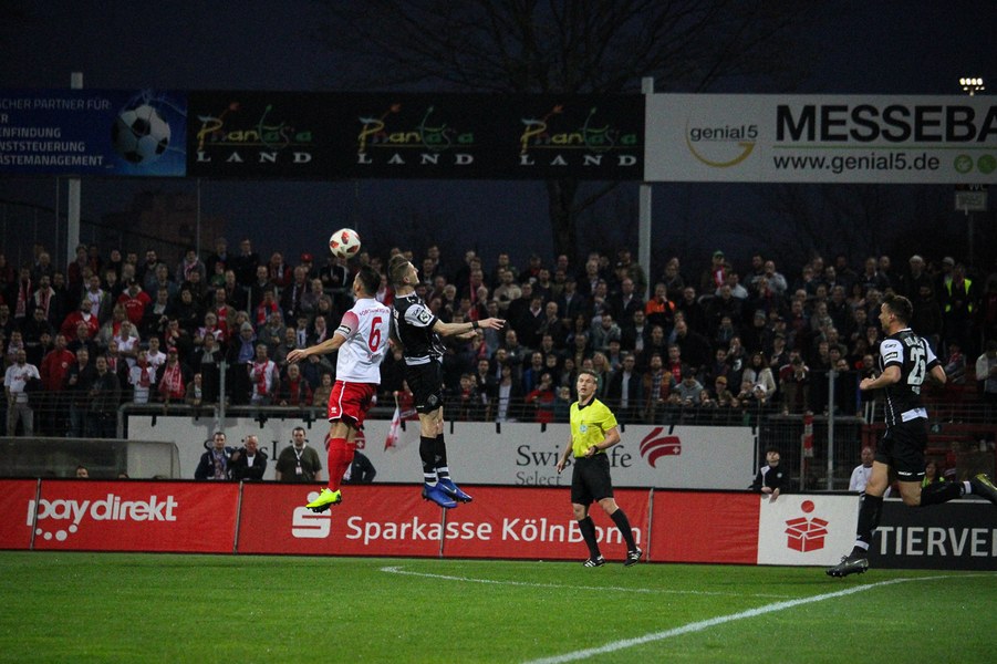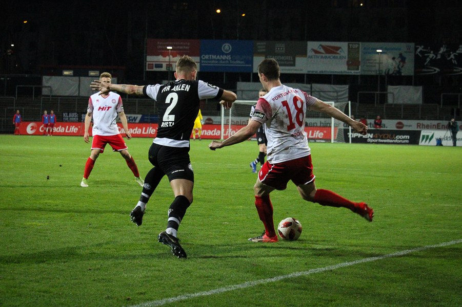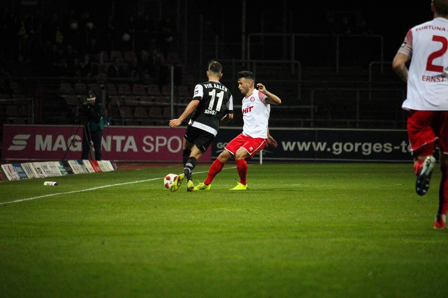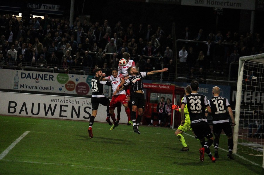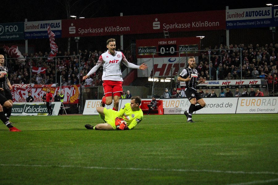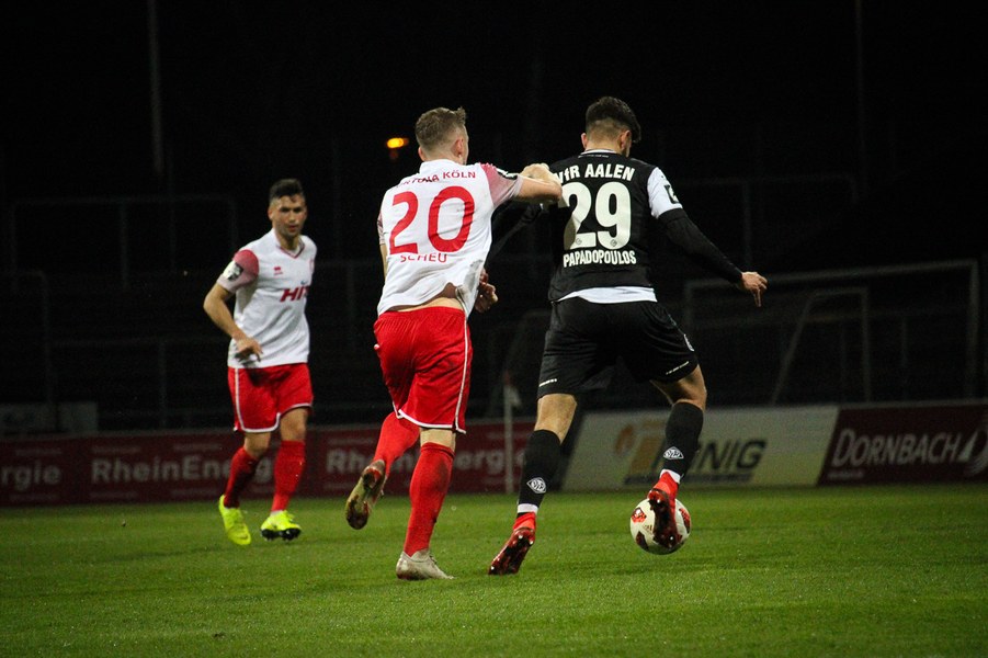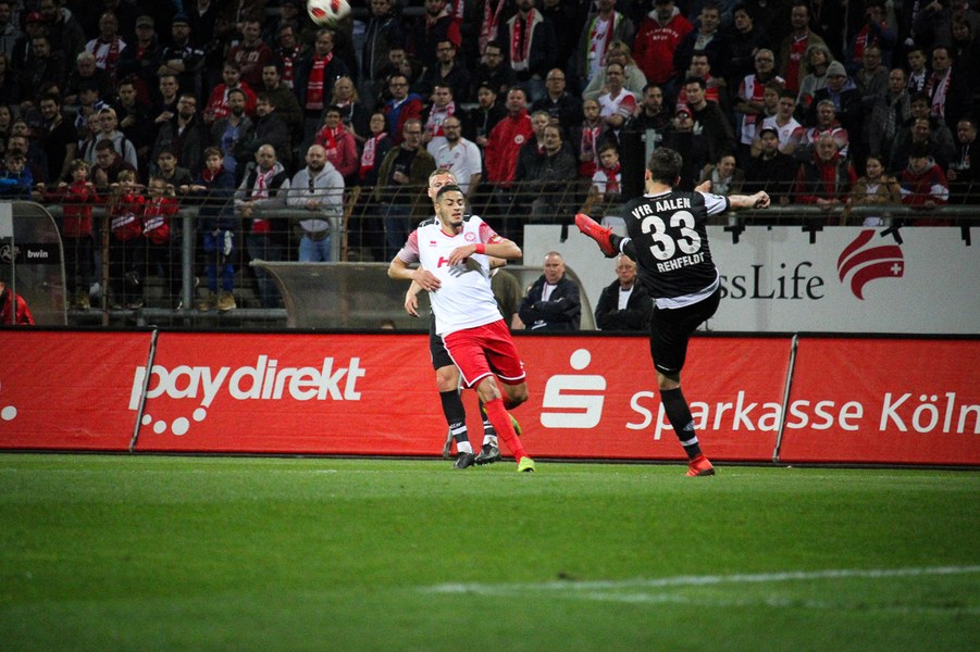 Die Bedeutung des Spiels war den Aktionen von der ersten Minute an anzumerken. Beide Teams agierten erst einmal sehr kontrolliert. Damit waren klare Möglichkeiten am Anfang Mangelware. Nach zehn Minuten sicherte sich Fortuna Köln mehr Spielanteile. Doch nach Foul von Robin Scheu bekam Aalen in der 19. Minute eine gute Freistoßchance. Nikolai Rehnen parierte den Linksschuss von Nicolas Sessa aus 28 Metern mit beiden Händen. Fünf Minuten später war es Stephan Andrist, der aus aussichtsreicher Position am Kölner Keeper scheiterte. Auch in der 30. Minute bewahrte Rehnen die Fortuna vor einem Rückstand. Ein Kopfball von Andrist nur 60 Sekunden später ging zum Glück der Südstädter ebenfalls knapp am Tor vorbei. Ein Schuss von Antonios Papadopoulos aus 16 Metern landete ebenso über dem Tor (36.).