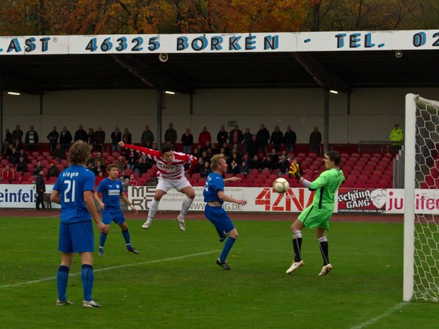 (Fabian Montabell erzielt per Kopfball die Führung gegen die Sportfreunde Siegen, Pedro Miletic hat keine Chance, Foto: Gert König)