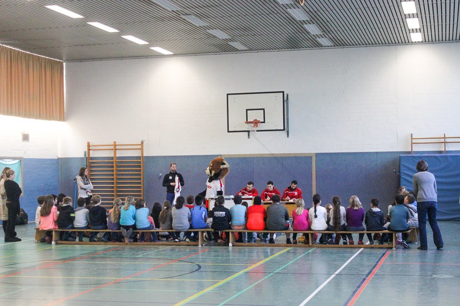 Die AOK-Schulaktionen gehören schon fast zur Routine für die Fortuna-Profis. Dabei ist der Spaß aber immer wieder aufs neue groß bei Kindern und Erwachsenen. Die drei Spieler von Fortuna Köln stellten an verschiedenen Stationen wieder einmal drei unterschiedliche Übungen vor, an denen sich die Schüler im Anschluss selbst probieren konnten. Nachdem Andersen, Bösing und Engelman die Kinder in zwei Gruppen durch den Morgen begleitet und zum Schwitzen gebracht haben, stand um 11 Uhr eine Begrüßung seitens der gesamten Schule auf dem Plan. Die Profis der Fortuna stellten sich den Fragen der wissbegierigen Schülern und verteilten im Anschluss Autogramme. Dabei ließen sich die Kinder nicht nur Autogramm-Karten beschriften, auch das Schuhwerk der Schüler wurde signiert.