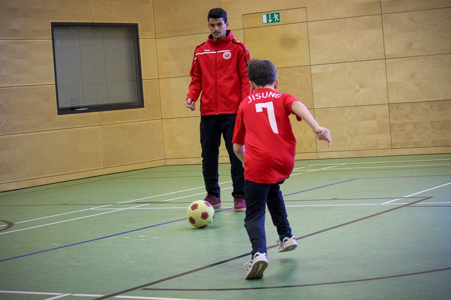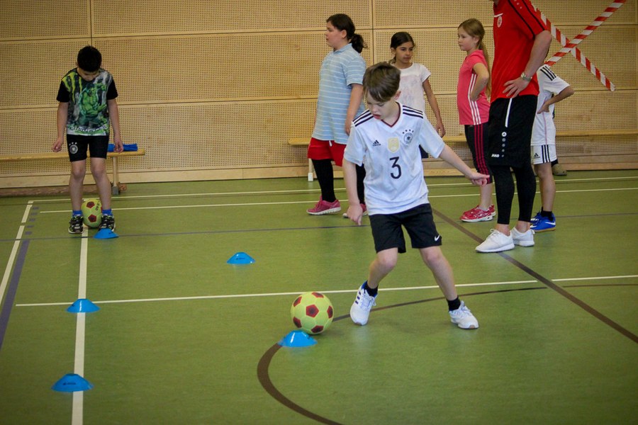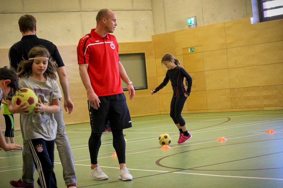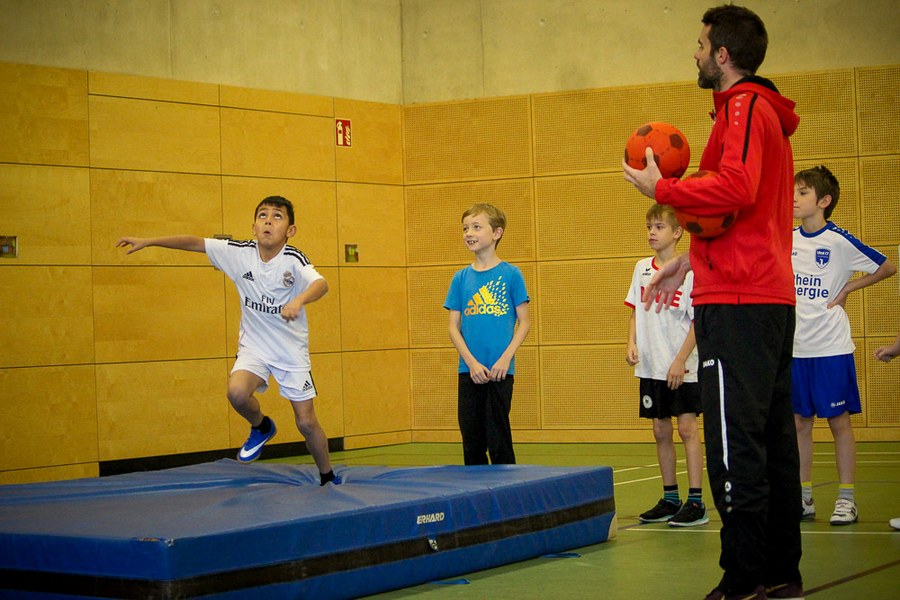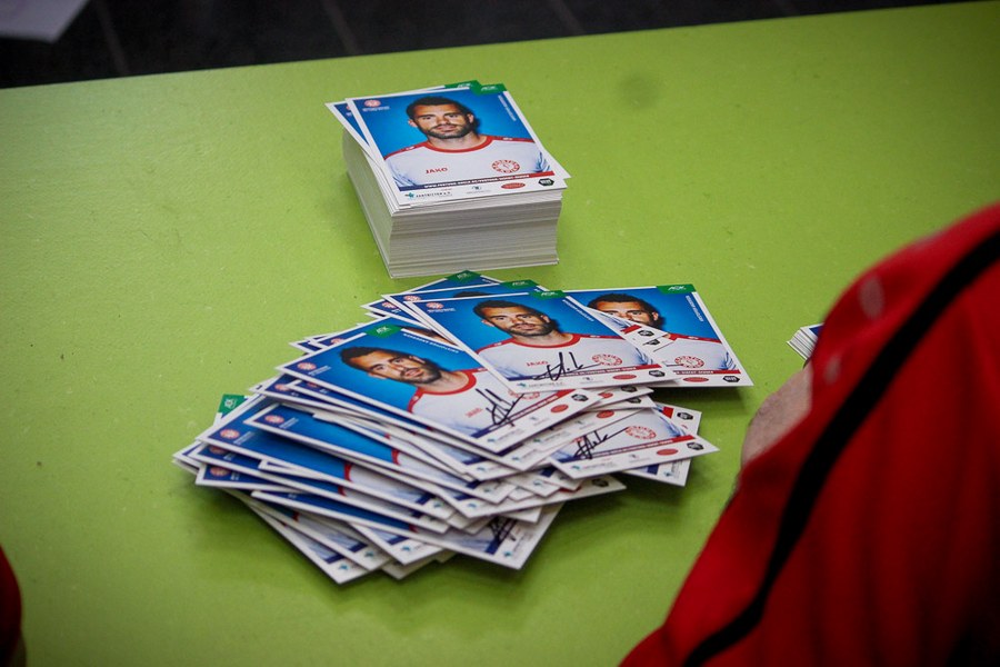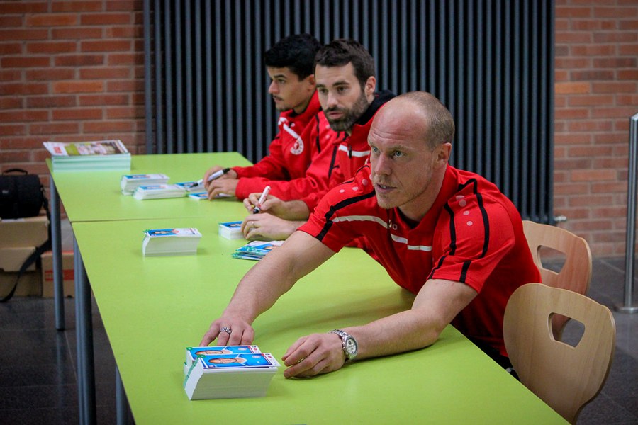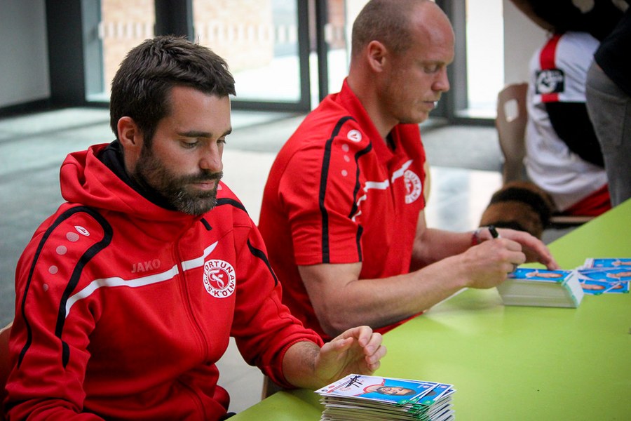 Zunächst trafen sich Fortuna-Spieler und die Schulkinder der Klassen 4a und 4b in der Turnhalle. Dort ging es natürlich schnell in den aktiven Teil des Programms über. Die Trainingseinheit gestaltete sich vielseitig. Im Hütchen-Parkour konnten sich die Schüler im Dribbling beweisen. Dank Sportmatte waren sogar gewagtere Aktionen, wie beispielsweise Fallrückzieher möglich. Nachdem man viel Energie im Training gelassen hatte, folgte mit einer Autogrammstunde ein ruhigerer Programmpunkt. An dieser Stelle war es für die Schüler natürlich wieder möglich Fragen an die Profis zu richten. Die Schülergruppe hatte sich zu diesem Zeitpunkt bunt durchgemischt, nun waren auch Kinder aus den Schulklassen eins bis drei vertreten. Andersen, Poggenborg und Souza wurden viele Autogramme los und verabschiedeten sich anschließend nach einem ereignisreichen Tag von den Kindern der Paul-Klee-Schule.