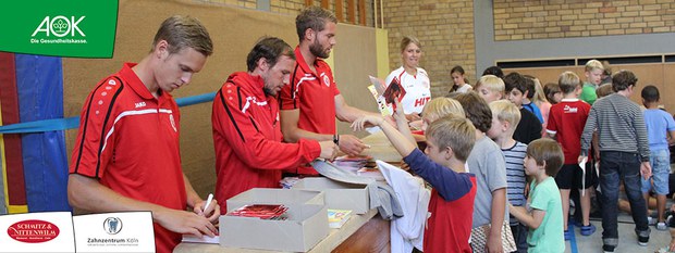 ufgeweckt und hochkonzentriert lauschten die 60 Schüler den Profis von Fortuna Köln bei deren Erläuterungen der aufgebauten Stationen. In einer Sache waren sich alle Schüler einig: „Die Station mit dem Fallrückzieher und dem Flugkopfball!“, bekam der Verantwortliche der Schulaktionen, David Picht, aus allen Richtungen als Antwort auf seine Frage, welche Übung den Kindern denn am meisten Spaß gemacht hat. „Die Kinder waren so ehrgeizig, dass ich irgendwann mehr als einen Ball gleichzeitig verwerfen musste“, bestätigte Fortuna Verteidiger Tobias Fink die Lernbereitschaft und Begeisterungsfähigkeit der Grundschüler. Für einen ganz besonderen Moment sorgte das neue Maskottchen Fred, das prompt seine Torhüterqualitäten zeigte und den ein oder anderen Ball unter großem Jubel der Schüler im Tor versenkte.