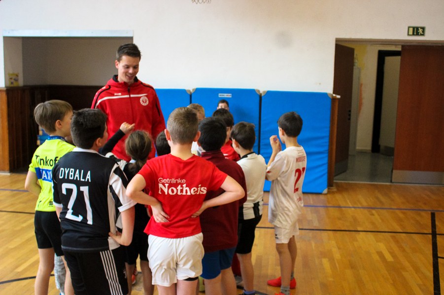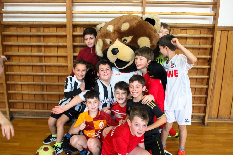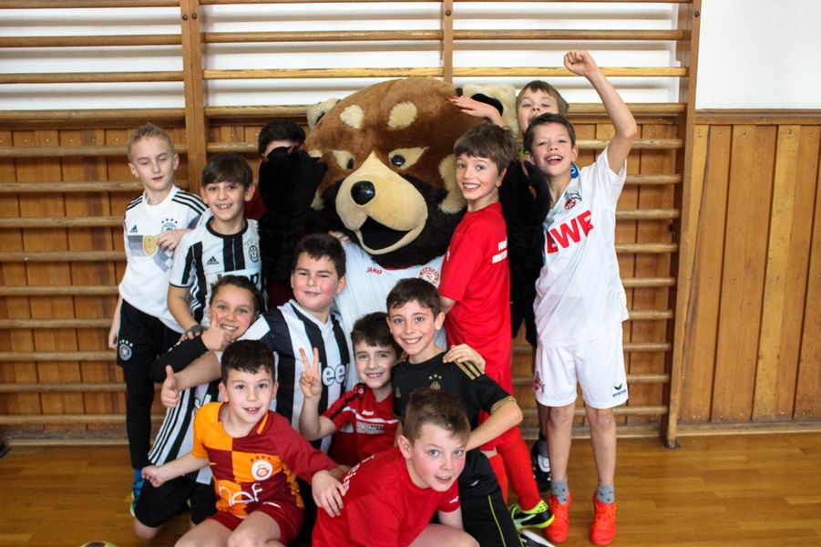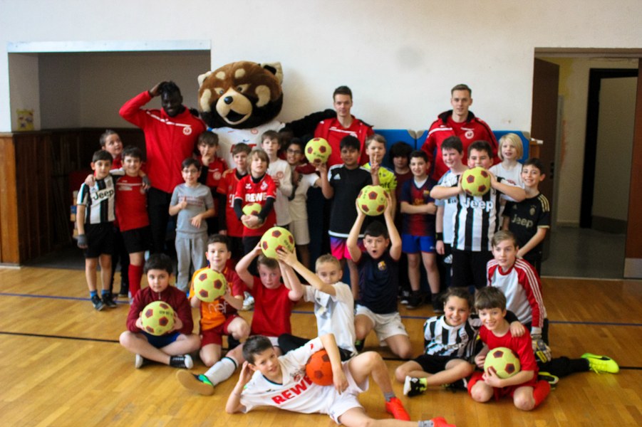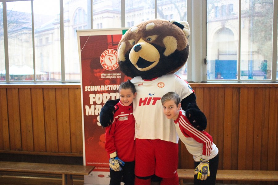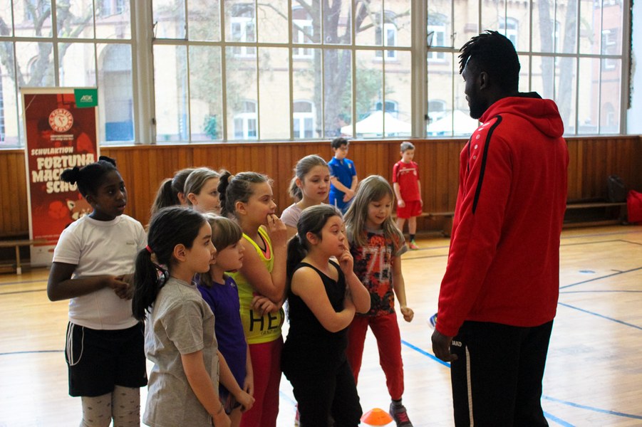 Wieder einmal ließ die Fortuna Kinderaugen strahlen. Es stand eine Schulaktion für die Fortuna-Profis an. Aus diesem Grund besuchten Lars Bender, Barnard Kyere und Christopher Theisen die Schüler der KGS Zugweg. Mit zwei Klassen stand als erstes das obligatorische Training an. Die drei Fortunen leiteten nicht nur die Einheit, sondern nahmen auch selbst daran teil. Insgesamt gab es drei verschiedene Übungen: Eine Schussübung, einen Hindernisparkour und eine Übung für Fallrückzieher sowie Flugkopfbälle. Die Klassen wurden immer in drei Gruppen aufgeteilt, die jeweils ein Profi begleitete.