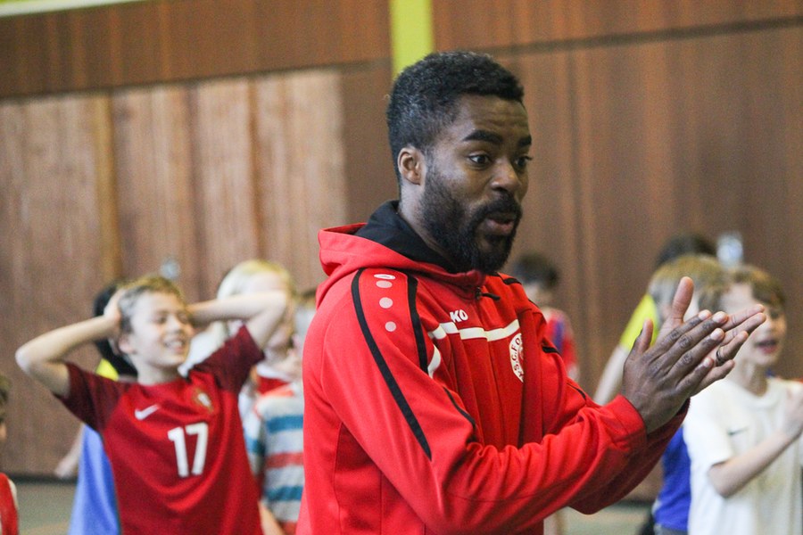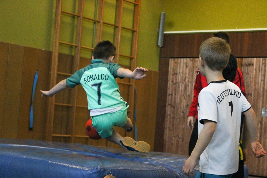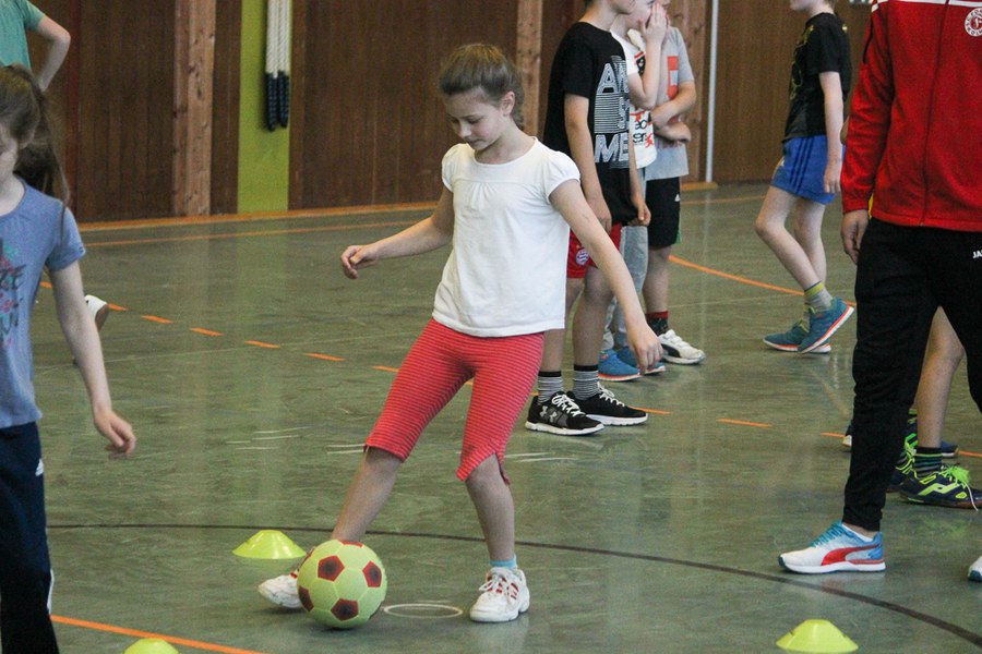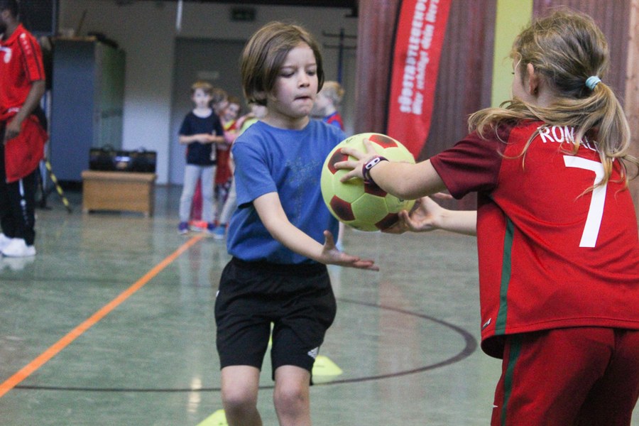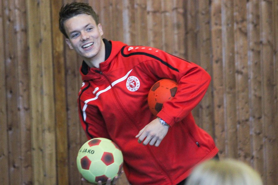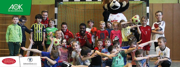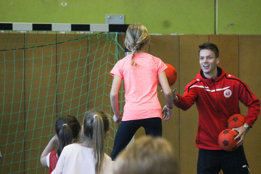 Der Montag-Morgen startete mit lachenden Gesichtern an der GGS Oberdollendorf - Christopher Theisen, Kusi Kwame, Tim Boss und Vereinsmaskottchen Fred hatten gute Laune mit nach Königswinter gebracht. Neben Übungen zum Torabschluss, Dribbling und Kopfbällen sorgten lustige Wettkämpfe für gehörig Spannung bei den Schülerinnen und Schülern der Grundschule. Wer es sich zutraute, durfte sich auch bei der Ausführung eines Fallrückziehers weiterbilden.
