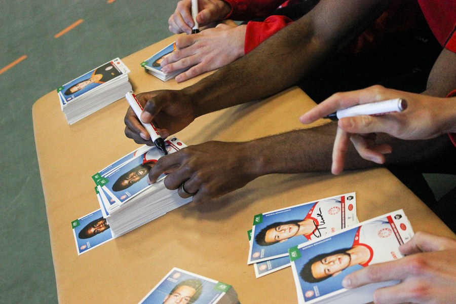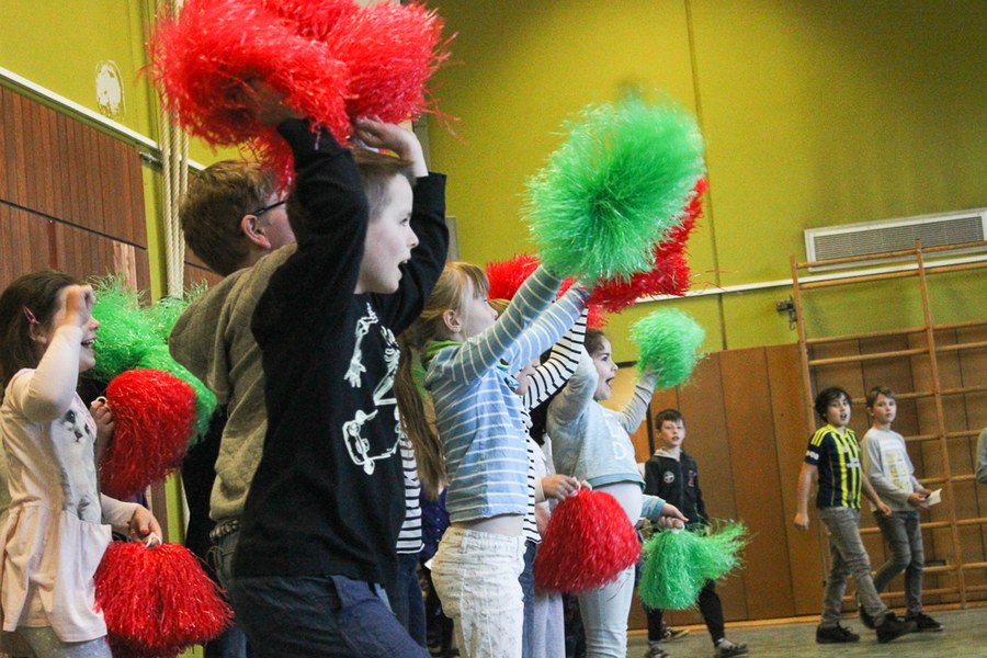 Im Anschluss an den sportlichen Teil kam die ganze Schule zusammen, um mehr über das Leben der Profi-Fußballer zu erfahren. Die Klassensprecher hatten im Vorfeld Fragen gesammelt und gaben diese als Vertreter der Klassen an die Fußballer der Fortuna weiter. Nachdem alle Fragen beantwortet waren und Christopher Theisen auch die Abseitsregel nicht unerklärt ließ, bedankten sich die Kinder bei den Südstadt-Fußballern mit einem gelungenen Überraschungsauftritt. Die drei Profis belohnten die Schüler daraufhin mit Autogrammkarten, Mannschaftspostern und Geschenktüten von Fortuna-Partner Schmitz & Nittenwilm.