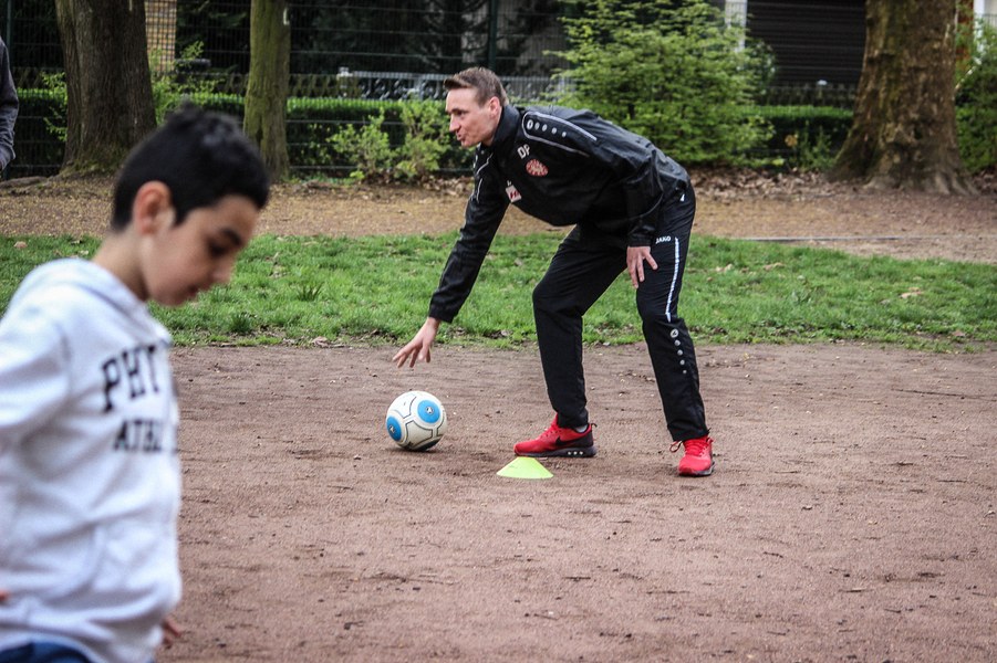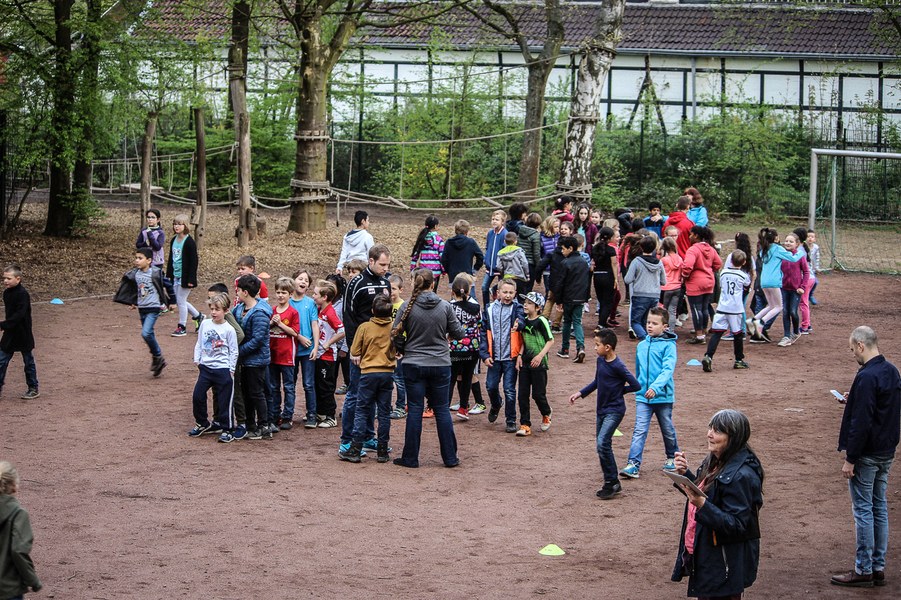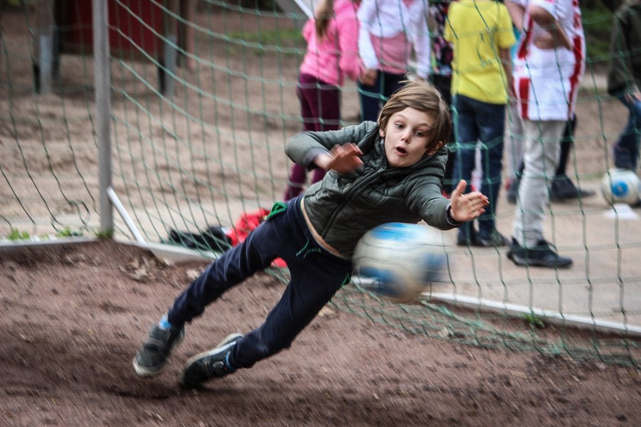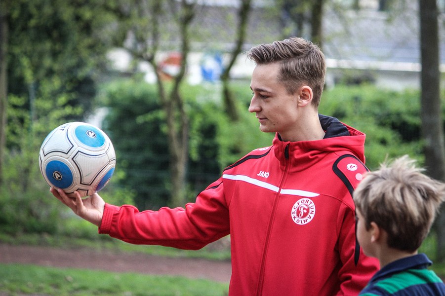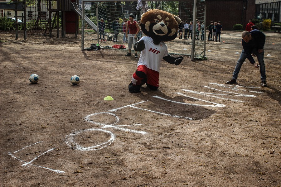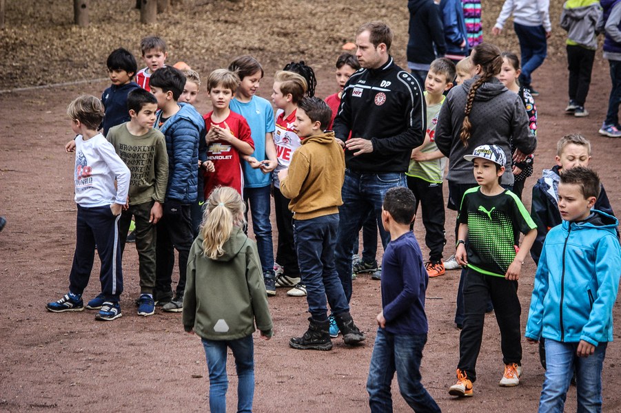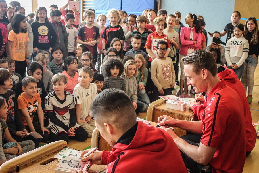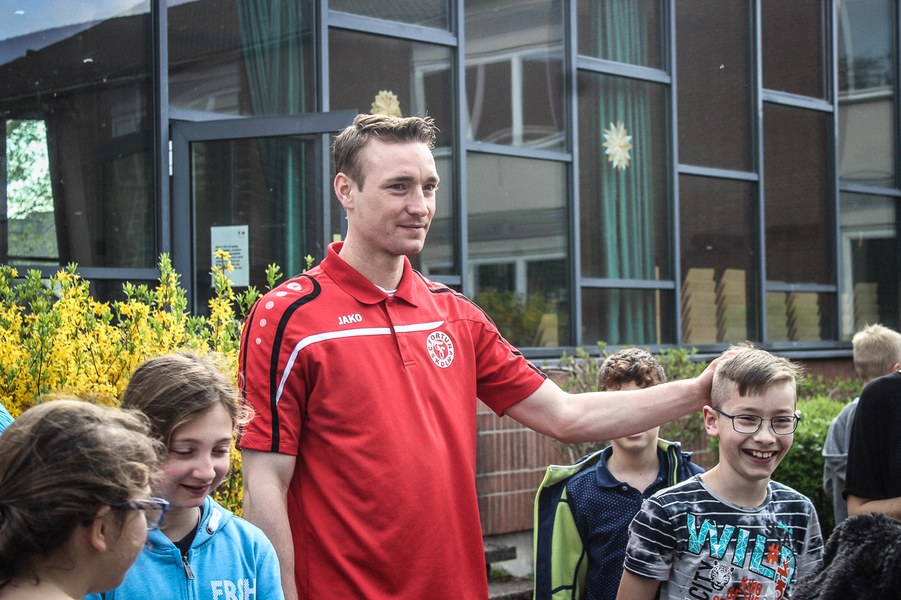 Der Einstieg in die Schulwoche war für die Kinder der Johannesschule in Höhenhaus diesmal etwas ganz Besonderes. Zusammen mit den drei Spielern Eichhorn, Ceylan und Menz von der Fortuna ging es raus auf den Schulhof, wo sie mit den Profis an der frischen Luft trainierten. Die Schüler der dritten und vierten Klassen teilten sich in drei Gruppen auf, die jeweils von einem Spieler geleitet wurden. Unter der Aufsicht von Ceylan dribbelten die Kids durch zwei Hütchenparcours, bei Menz wurde auf das Tor geschossen und Eichhorn lenkte eine Spielform, bei der die Kinder in zwei Mannschaften auf Hütchentore spielten. In regelmäßigen Abständen wurden die Gruppen gewechselt, sodass alle Kinder die unterschiedlichen Stationen einmal ausprobieren konnten. Bei sonnigem Wetter hielten es die Schüler lange draußen aus, bis es nach über zwei Stunden rund ums Fußballspielen schließlich in die Turnhalle der Grundschule ging, wo die Profis sich Autogrammen und Fragen widmeten. Vorher sangen die Schüler der Johannesschule noch gemeinsam die Hymne der Fortuna. Anschließend wollten die Kinder wissen, wann die Spieler ihr erstes Tor im Profifußball geschossen haben, welchen Verein sie außer der Fortuna besonders gern haben und wie es sich anfühlt, wenn man eine rote Karte bekommt. Das Interesse der Schüler war riesig, neben den im Voraus vorbereiteten Fragen ergaben sich im Laufe des Tages noch viele weitere, die beantwortet wurden. Als Andenken an den Tag mit den Profis der Fortuna gab es für jedes Kind Autogramme der drei anwesenden Spieler sowie ein Mannschaftsfoto der aktuellen Saison. Auch das Maskottchen Fred stand für Erinnerungsfotos zur Verfügung.