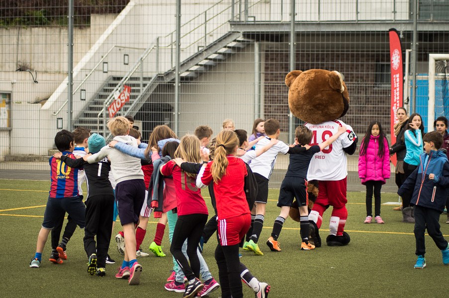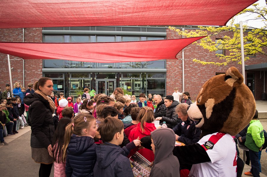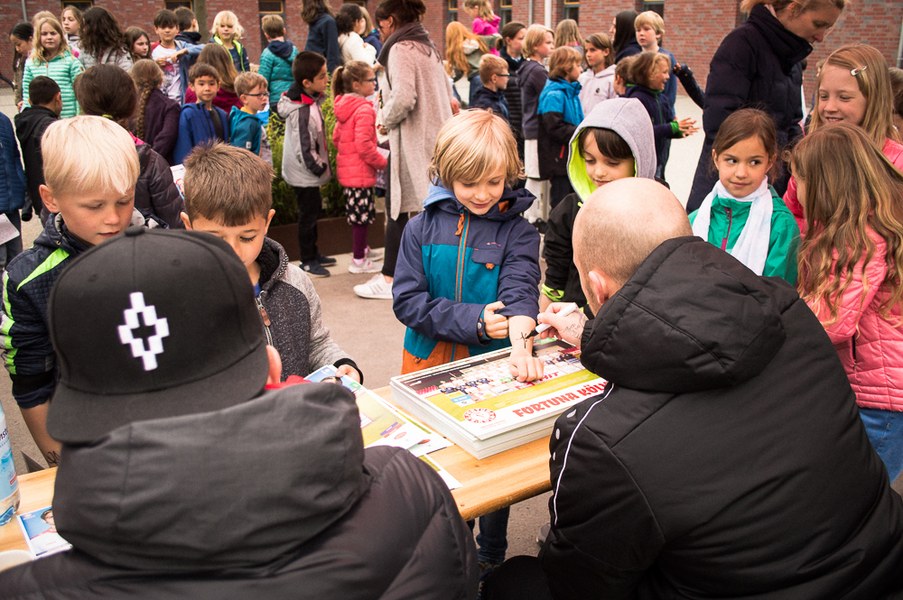 Anschließend ging es für die drei Fortunen auf den Schulhof, wo knapp 500 Schüler und Schülerinnen mit Fragen warteten. So wurden Exslager, Röcker und Hafkemeyer beispielsweise nach ihrem schönsten Erlebnis als Fußballprofi gefragt. Anschließend gab es eine gemeinsame Autogrammstunde. Die Kinder der Olympia-Schule werden die Fortuna am kommenden Samstag beim Heimspiel gegen den MSV Duisburg besuchen.