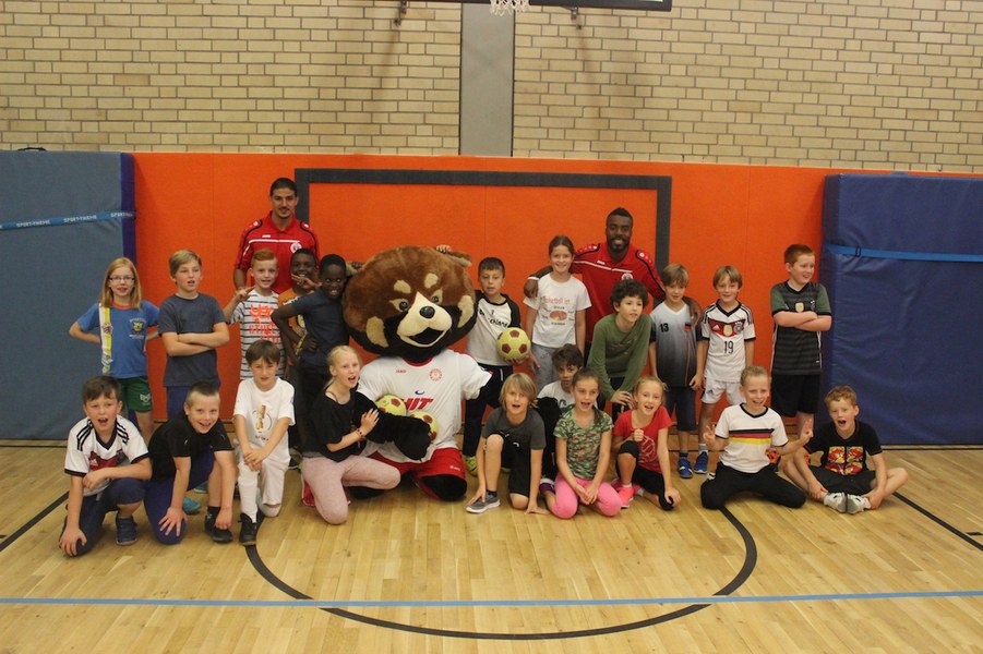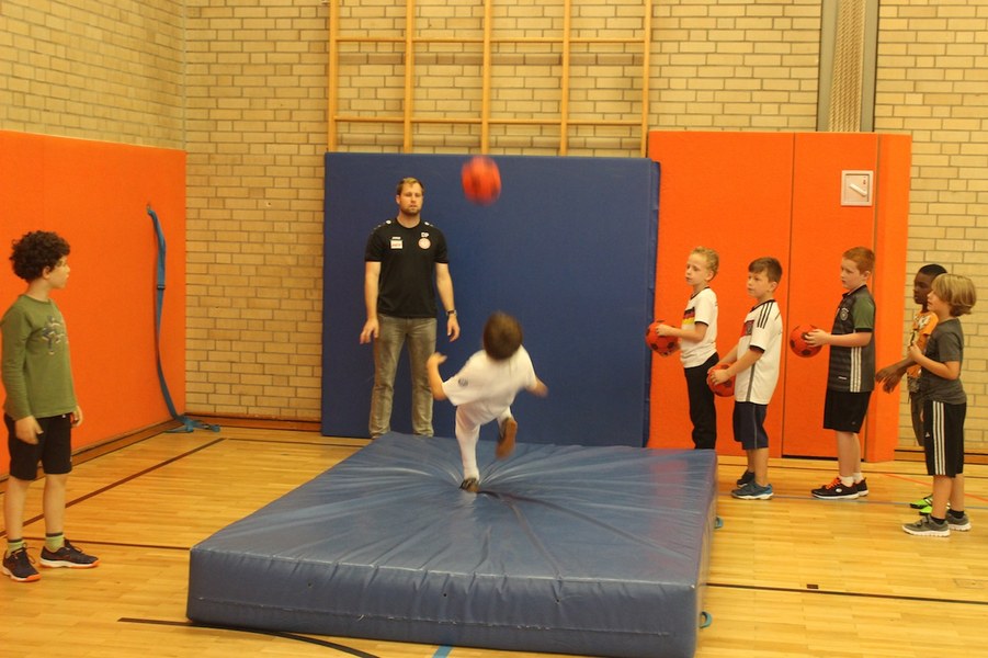 Für die Kinder war das Training in der Sporthalle eine schöne Abwechslung zum Unterricht am Montagmorgen. An drei Stationen wurden von den beiden Profis verschiedene Übungen wie Dribblings und Torschüsse erklärt und geleitet. Mit Tipps und Tricks wurden die Kinder unterstützt und hatten dabei sichtlich Spaß.