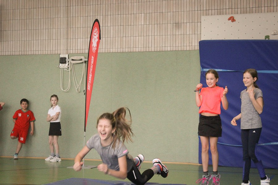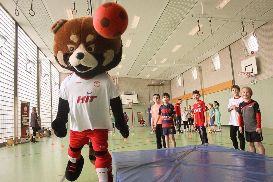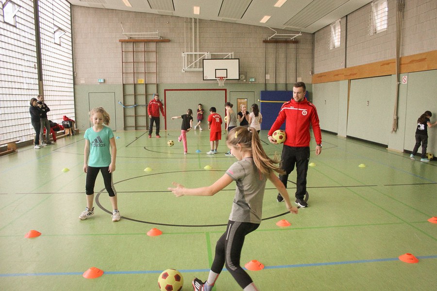 Zu Beginn des Tages wurden die Schüler in unterschiedliche Gruppen aufgeteilt. An drei Stationen wartete jeweils ein Fortuna-Profi, um das Dribbling, den Abschluss und das Kopfballspiel der Kinder zu schulen. Nachdem mit diesem Programmpunkt der sportliche Teil des Tages abgeschlossen war, ging es in die Aula der Schule. Mit einer Überraschung wartete man hier bereits gespannt auf die Fortuna-Profis. In der Aula führten die Schüler die Fortuna-Hymne mit einer kleinen Tanzeinlage auf, sehr zur Freude von Schneider, Schröder und Uaferro.