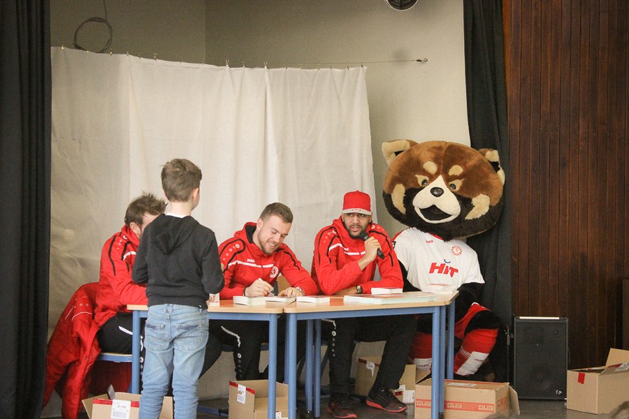 Im Anschluss startete eine Fragerunde. Die Südstadt-Kicker ließen keine Antwort offen und sorgten für eine heitere Atmosphäre in der Aula. Danach durften sich alle Kinder der Schule noch Autogramme, Mannschaftsposter und eine Brötchen-Tüte von Fortuna-Partner Schmitz & Nittenwilm abholen.