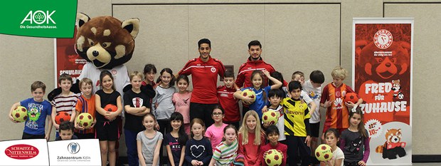 Wegen des schlechten Wetters fand die gemeinsame Trainingseinheit heute in der Turnhalle der Schule statt. Zusammen mit den beiden Fortuna-Kickern Can Serdar und Hamdi Dahmani verbesserten die Kinder ihre Fähigkeiten im Dribbling, Passspiel und Torschuss. Natürlich durften sich alle auch am perfekten Fallrückzieher versuchen. Mittendrin war auch wieder Maskottchen Fred, mit dem die Schülerinnen und Schüler besonders viel Spaß hatten.