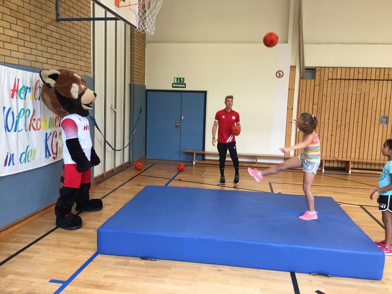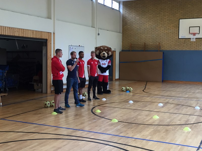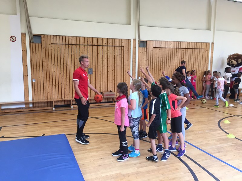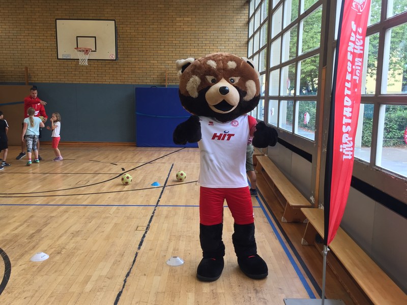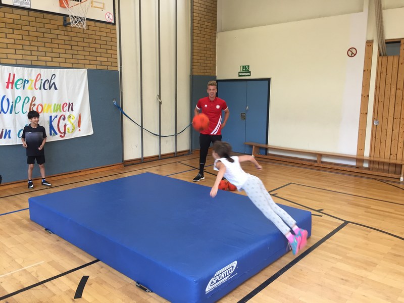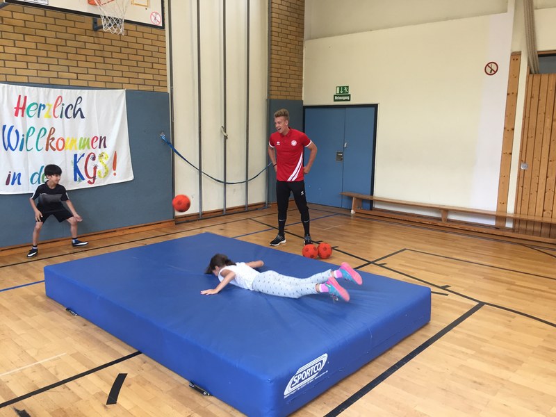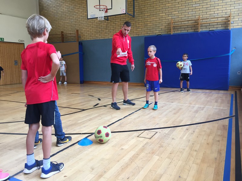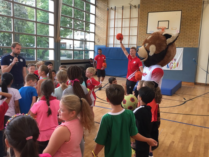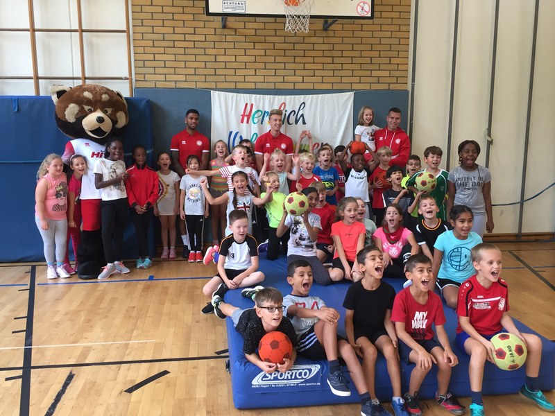 Zwar sind die Sommerferien schon eine Weile vorbei, doch am Montag, den 10. September ist wohl jedes Kind der KGS Andreas-Hermes-Straße noch lieber als sonst zur Schule und am Vorabend freiwillig früh ins Bett gegangen. Schließlich standen am Montagmorgen die drei Fortuna-Profis Yeboah, Bröker und Brandenburger auf der Matte, um mit den Kindern zusammen zu trainieren. Mit den 3. und 4. Klässlern der Grundschule trafen sich die Spieler in der Turnhalle, wo die Kinder an verschiedenen Stationen ihr Ballgefühl unter Beweis stellen konnten. Beim Hütchenparcours, Torschusstraining oder als Torwart - an jeder Station war etwas anderes gefordert. Jede Übung verlief unter den Augen eines Profis. So konnten die Spieler den Kindern gezielt Verbesserungsvorschläge geben und auf individuelle Stärken und Schwächen eingehen. Nico Brandenburger war sich selbst nicht zu schade und schmiss sich auch einige Male auf die große Matte. Wer zwischendurch etwas Abwechslung brauchte, konnte mit Maskottchen Fred herumalbern. Fred selbst spielte bei der ein oder anderen Übung sogar mit. Als alle Kinder jede Station einmal durchlaufen hatten, konnten sie im Anschluss daran den Profis viele Fragen stellen und Einblicke in das Leben eines Fußballers bekommen. Als Andenken an den besonderen Tag mit den Fußballern aus der Südstadt gab es für jeden noch signierte Autogrammkarten und ein Mannschaftsfoto der aktuellen Saison. Im nächsten Heimspiel der Saison gegen die Sportfreunde Lotte darf die Fortuna die Schüler und Klassenlehrer der KGS Andreas-Hermes-Straße im Südstadion begrüßen.