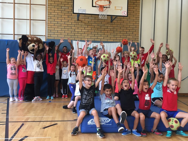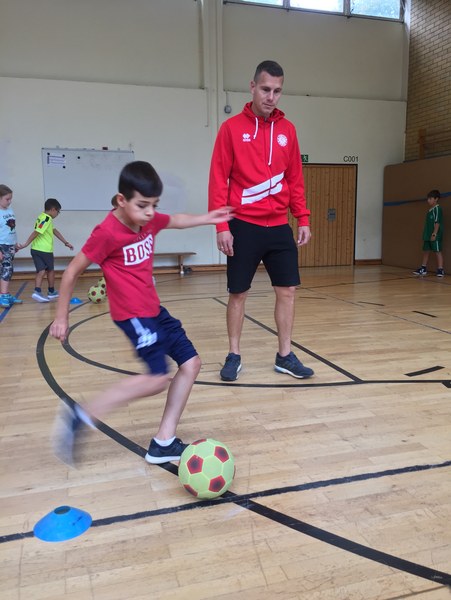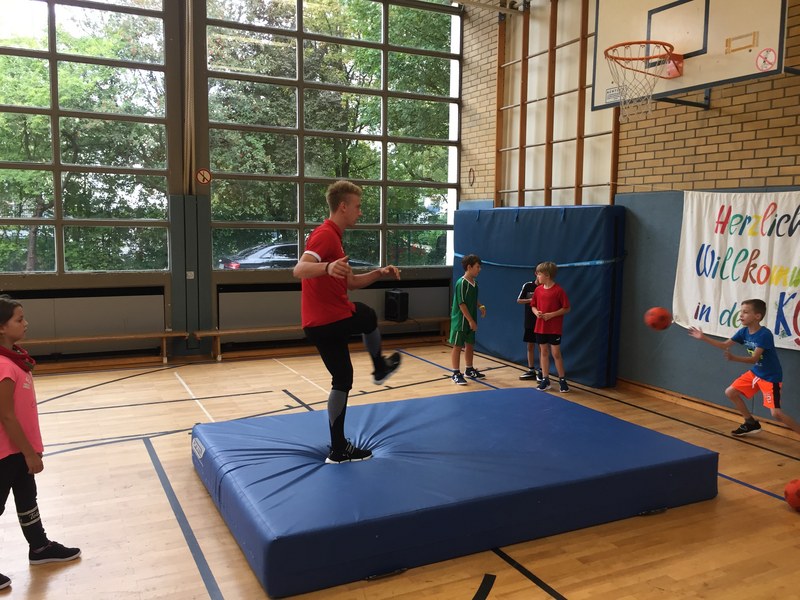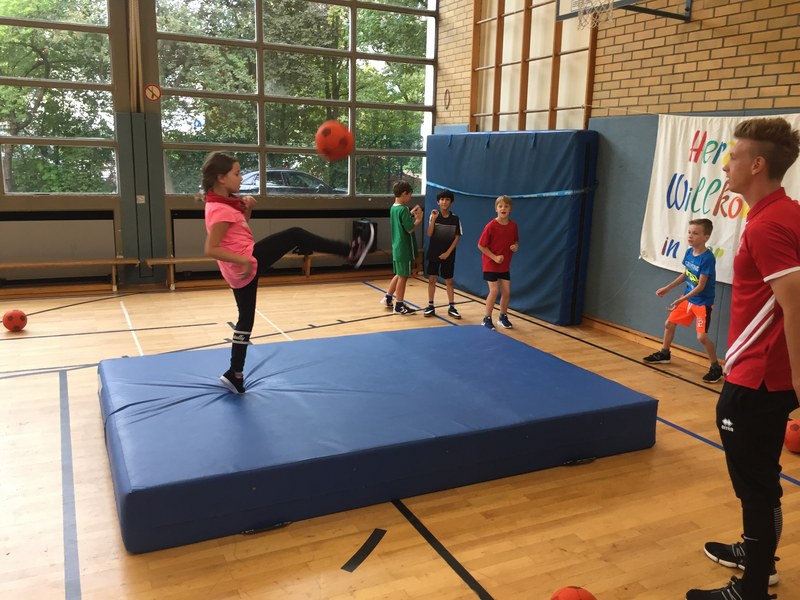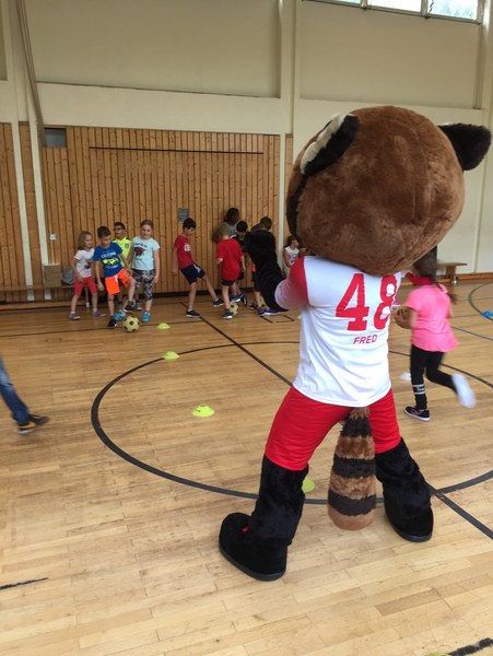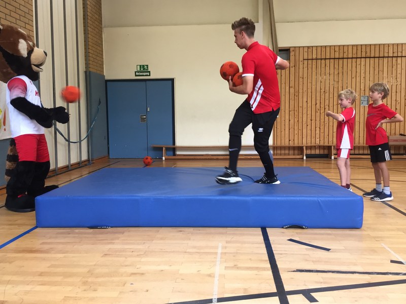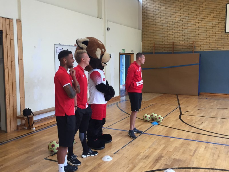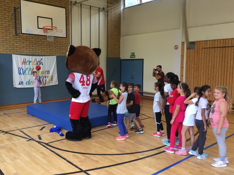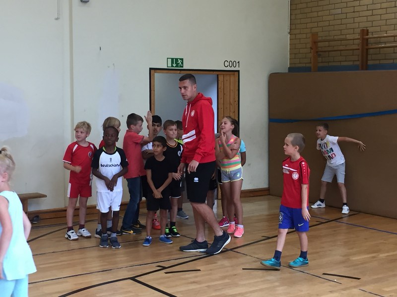 Zwar sind die Sommerferien schon eine Weile vorbei, doch am Montag, den 10. September ist wohl jedes Kind der KGS Andreas-Hermes-Straße noch lieber als sonst zur Schule und am Vorabend freiwillig früh ins Bett gegangen. Schließlich standen am Montagmorgen die drei Fortuna-Profis Yeboah, Bröker und Brandenburger auf der Matte, um mit den Kindern zusammen zu trainieren. Mit den 3. und 4. Klässlern der Grundschule trafen sich die Spieler in der Turnhalle, wo die Kinder an verschiedenen Stationen ihr Ballgefühl unter Beweis stellen konnten. Beim Hütchenparcours, Torschusstraining oder als Torwart - an jeder Station war etwas anderes gefordert. Jede Übung verlief unter den Augen eines Profis. So konnten die Spieler den Kindern gezielt Verbesserungsvorschläge geben und auf individuelle Stärken und Schwächen eingehen. Nico Brandenburger war sich selbst nicht zu schade und schmiss sich auch einige Male auf die große Matte. Wer zwischendurch etwas Abwechslung brauchte, konnte mit Maskottchen Fred herumalbern. Fred selbst spielte bei der ein oder anderen Übung sogar mit. Als alle Kinder jede Station einmal durchlaufen hatten, konnten sie im Anschluss daran den Profis viele Fragen stellen und Einblicke in das Leben eines Fußballers bekommen. Als Andenken an den besonderen Tag mit den Fußballern aus der Südstadt gab es für jeden noch signierte Autogrammkarten und ein Mannschaftsfoto der aktuellen Saison. Im nächsten Heimspiel der Saison gegen die Sportfreunde Lotte darf die Fortuna die Schüler und Klassenlehrer der KGS Andreas-Hermes-Straße im Südstadion begrüßen.
