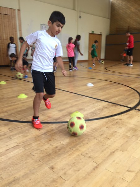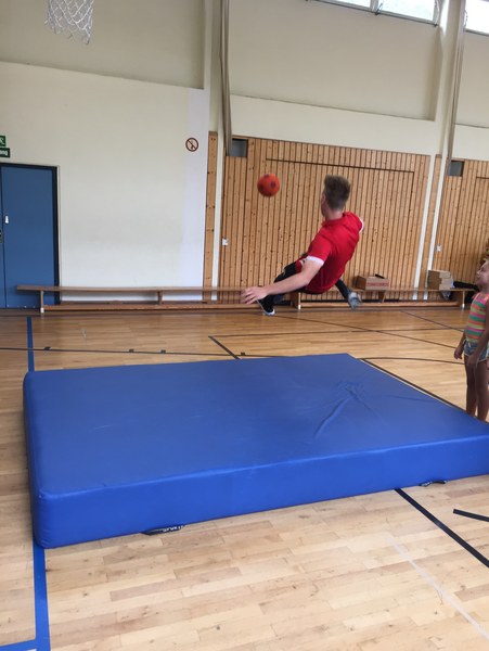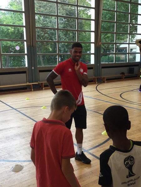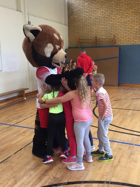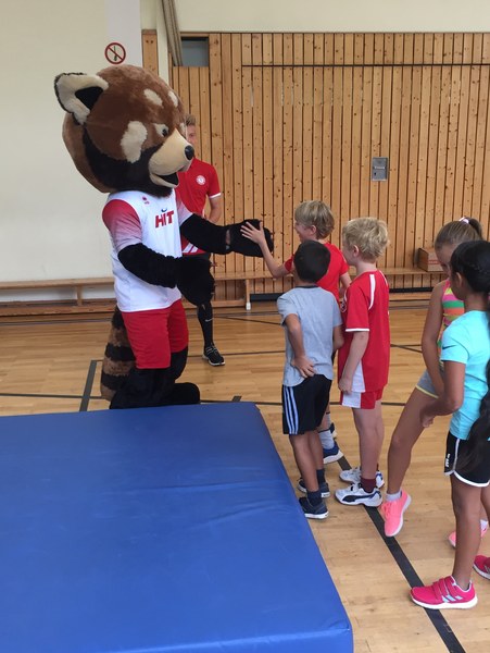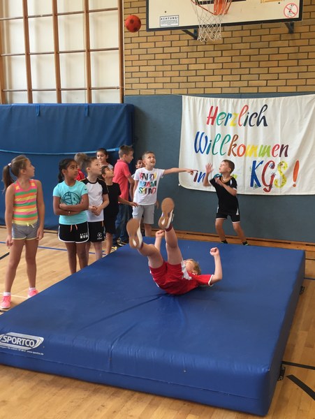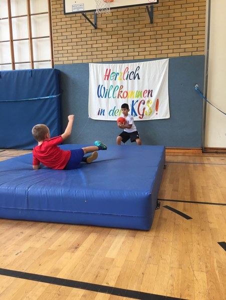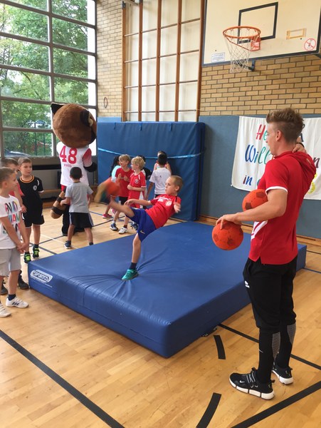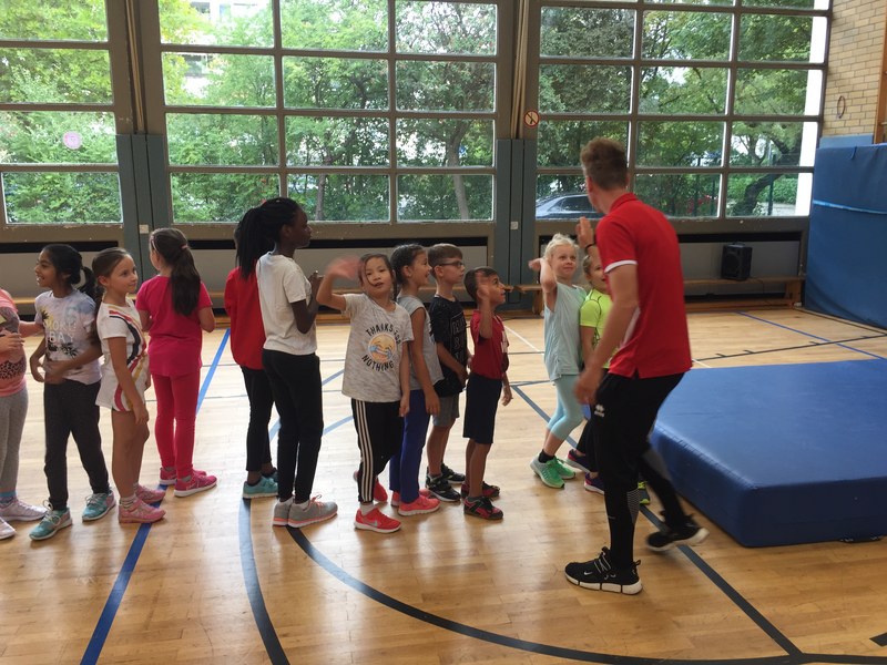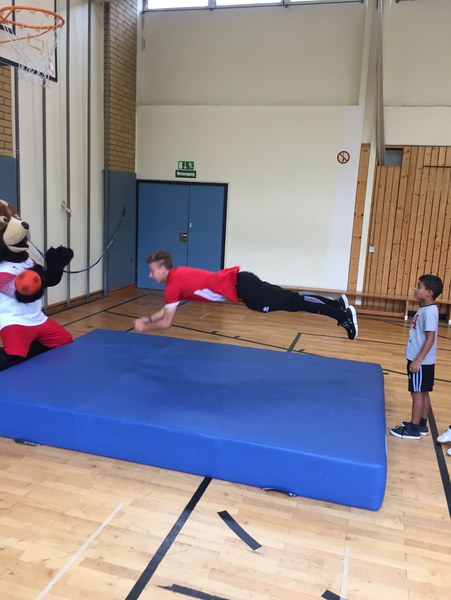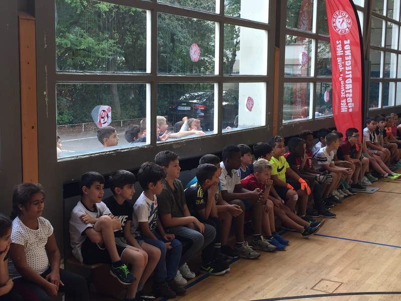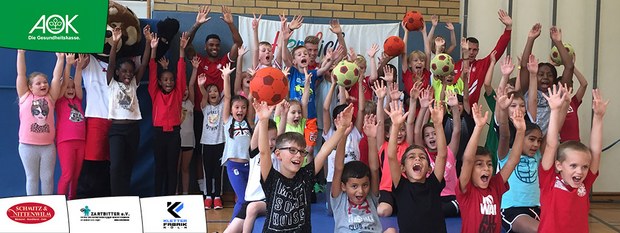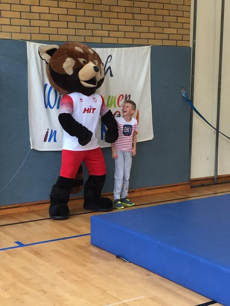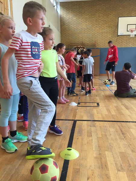 Zwar sind die Sommerferien schon eine Weile vorbei, doch am Montag, den 10. September ist wohl jedes Kind der KGS Andreas-Hermes-Straße noch lieber als sonst zur Schule und am Vorabend freiwillig früh ins Bett gegangen. Schließlich standen am Montagmorgen die drei Fortuna-Profis Yeboah, Bröker und Brandenburger auf der Matte, um mit den Kindern zusammen zu trainieren. Mit den 3. und 4. Klässlern der Grundschule trafen sich die Spieler in der Turnhalle, wo die Kinder an verschiedenen Stationen ihr Ballgefühl unter Beweis stellen konnten. Beim Hütchenparcours, Torschusstraining oder als Torwart - an jeder Station war etwas anderes gefordert. Jede Übung verlief unter den Augen eines Profis. So konnten die Spieler den Kindern gezielt Verbesserungsvorschläge geben und auf individuelle Stärken und Schwächen eingehen. Nico Brandenburger war sich selbst nicht zu schade und schmiss sich auch einige Male auf die große Matte. Wer zwischendurch etwas Abwechslung brauchte, konnte mit Maskottchen Fred herumalbern. Fred selbst spielte bei der ein oder anderen Übung sogar mit. Als alle Kinder jede Station einmal durchlaufen hatten, konnten sie im Anschluss daran den Profis viele Fragen stellen und Einblicke in das Leben eines Fußballers bekommen. Als Andenken an den besonderen Tag mit den Fußballern aus der Südstadt gab es für jeden noch signierte Autogrammkarten und ein Mannschaftsfoto der aktuellen Saison. Im nächsten Heimspiel der Saison gegen die Sportfreunde Lotte darf die Fortuna die Schüler und Klassenlehrer der KGS Andreas-Hermes-Straße im Südstadion begrüßen.