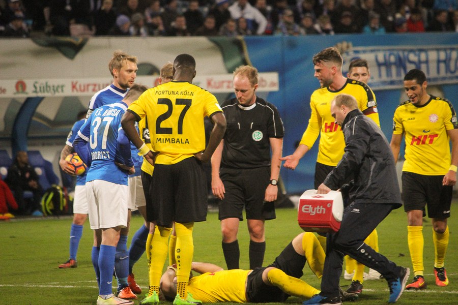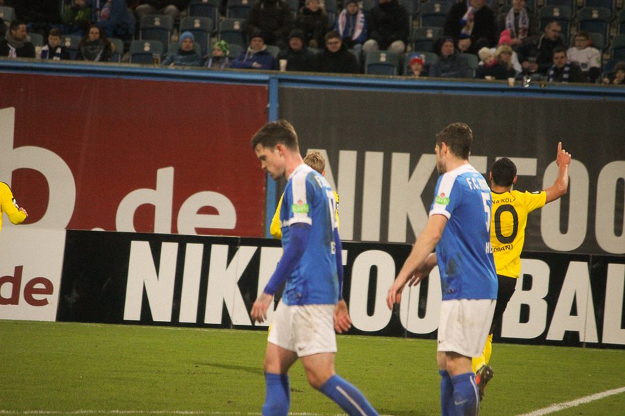 Mit der ersten Aktion nach dem Anpfiff provoziert die Fortuna beinahe ein Eigentor (1.). Es war ein guter Auftakt der Fortuna, auch wenn Hansa in der Folge das Spiel in Richtung Kölner Hälfte verlegte. Mit einem Volley von Bender hatten die Südstädter aber zunächst die gefährlicheren Abschlusssituationen (10.). Hansa hatte aber mehr vom Ball und erspielte sich eine Vielzahl an Standardsituationen. Nach der vierten Rostocker Ecke kam Henn mal zum Abschluss (17.). Richtig gefährlich wurde es auf beiden Seiten allerdings nicht. Der Fokus lag darauf, Fehler zu vermeiden. So dominierten kompakte Defensiven das Geschehen. Nach einem Ballgewinn von Kessel hatte die Fortuna mal etwas Platz zum Gegenstoß, aber Kessels Schuss von der Strafraumkante wurde geblockt (32.). Das Publikum wurde im Anschluss unruhiger, weil Rostock wenig Ideen versprühte. Einzig Bischoff versuchte das Spiel an sich zu reißen, mit bis dato mässigem Erfolg. Die Fortuna hatte so die griffigeren Aktionen. Ein Schussansatz und ein Kopfball von Theisen strahlten aber ebenso nicht die ganz große Torgefahr aus (37./45.), sodass es torlos in die Kabine ging.