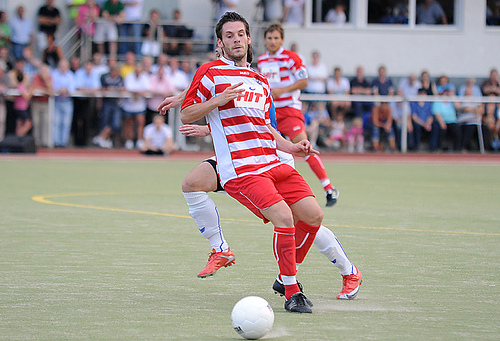 (Kevin Kruth musste später, nach einem Zusammenprall mit seinem Gegenspieler, den Platz mit einem Schlüsselbeinbruch verlassen, Foto: B. Lehmann)