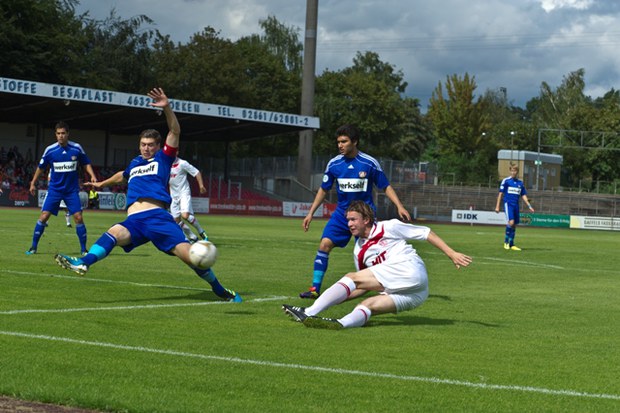 (Steffen Moritz hat hier die Chance, die Führung zu erzielen, wird aber ein wenig zu weit nach links abgedrängt, Foto: Gert König)