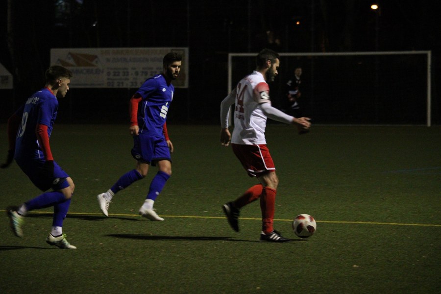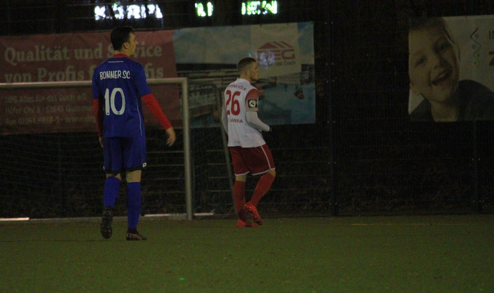 In der 24. Minute gab es den ersten Rückschlag: David Bors traf aus heiterem Himmel per Rechtsschuss ins untere linke Eck der Kölner. Jannik Bruhns, der Nikolai Rehnen an diesem Abend im Tor ersetzte, war chancenlos. Die Gäste agierten danach sicherer und kontrollierten häufig den Ball. Nachdem Vojno Jesic mit einem Rechtsschuss noch an Bruhns scheiterte (34.), machte es Mario Weber nur eine Minute später besser und versenkte den Ball aus fünf Metern Entfernung zum 2:0 für den Bonner SC. In der 42. Minute hatte Daniel-Danso Somuah sogar das 3:0 auf dem Fuß. Aber er scheiterte, frei auf das Tor zulaufend, am Kölner Keeper. Bis zur Halbzeit passierte dann nichts mehr, so ging Bonn mit einem komfortablen Vorsprung in die Pause.