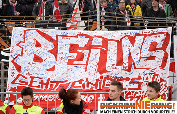 Bereits beim Heimspiel gegen Holstein Kiel im vergangenen Jahr initiierte der Fanclub SC Mülltonn 98 eine Aktion gegen Rassismus. Damals ließen die Fortuna-Fans alle Zuschauer vor dem Stadion auf einem großen Banner mit der Aufschrift "Bei uns geht einiges - außer Homophobie und Rassismus" unterschreiben und hingen den Banner anschließend während des Spiels auf.