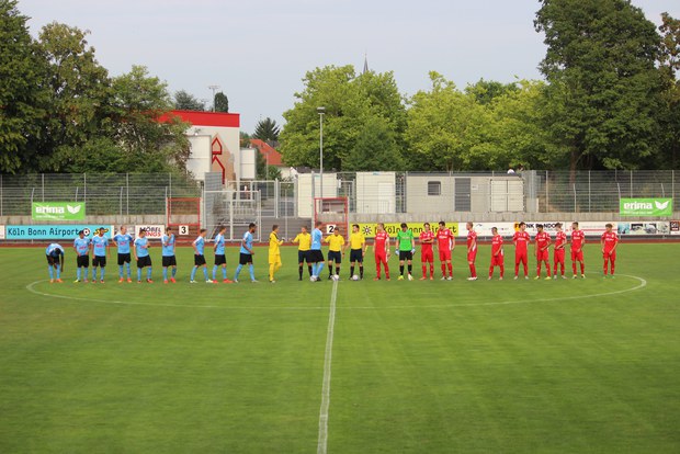 Das Spiel startete mit einem Aufreger als die Hennefer nach nur wenigen Sekunden den Ball nur knapp am Kölner Tor vorbei schossen. Es dauerte bis zur siebten Minute ehe sich Marc Brasic stark gegen drei Gegner durchsetzte, die folgende Flanke fand jedoch keinen Fortunen. In der 15. Minute konnten die mitgereisten Fortuna-Fans das erste Mal jubeln, jedoch stand Christopher Theisen bei seinem Tor im Abseits. Die Fortuna nahm nun das Heft und kreierte weitere Chancen, beispielsweise einen abgeblockten Koruk Schuss oder einen Freistoß von Souza (19./26.). Noch knapper war die Ecke getreten von Cauly Oliveira Souza, die Uaferro knapp über das Tor köpfte (32.). Hennef konnte sich in erster Linie mit Kontern weiterhelfen. Dies gelang in der 35. Minute als eine Flanke von links in den Strafraum segelte und Klug den Ball annehmen und ins Netz versenken konnte. Die Antwort der Fortuna ließ aber nur zwei Minuten auf sich warten: Koruk eroberte den Ball im Mittelfeld, steckte durch zu Souza, der den Ball trocken im langen Eck versenkte. Bis zur Halbzeit sollte nichts mehr passieren.