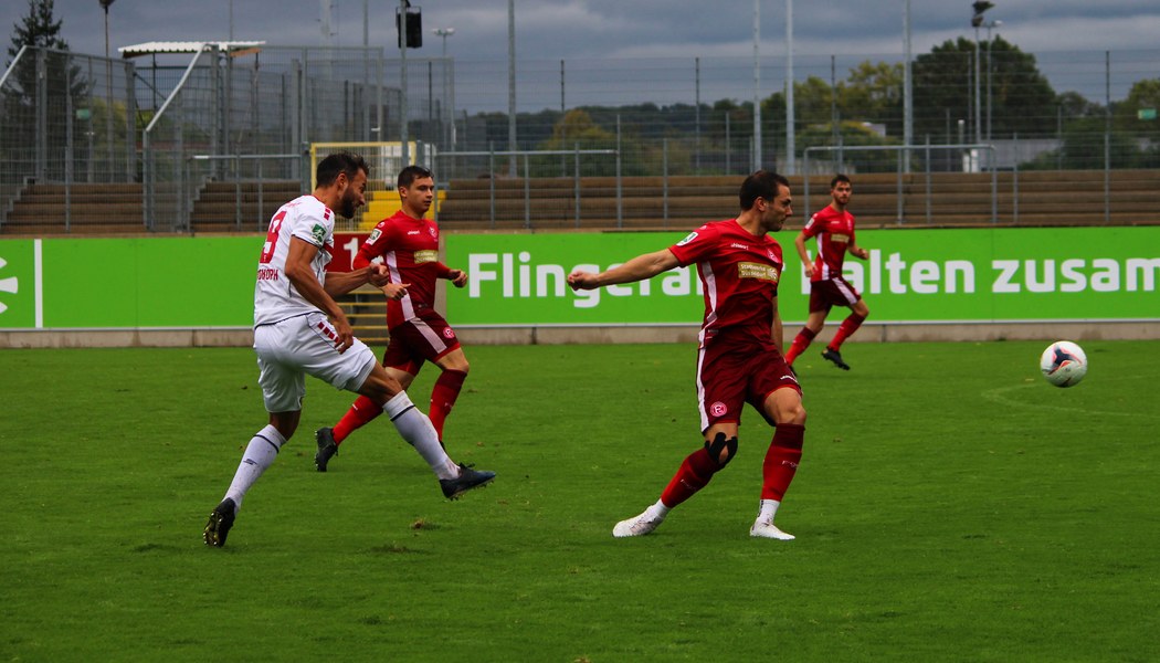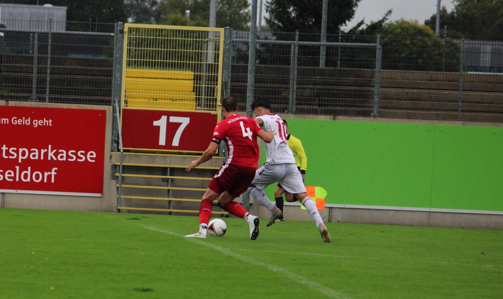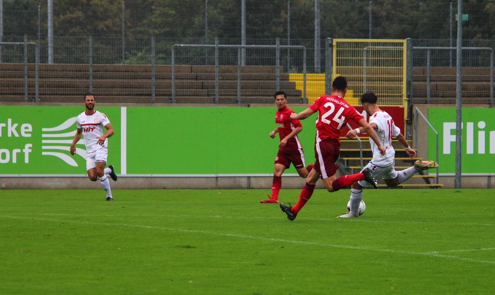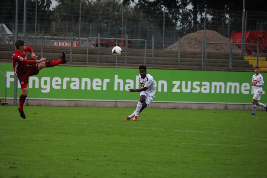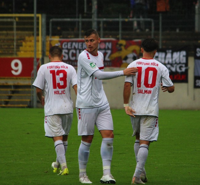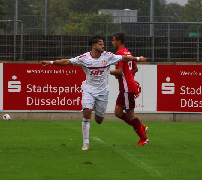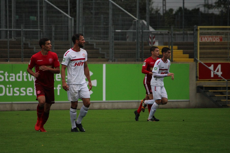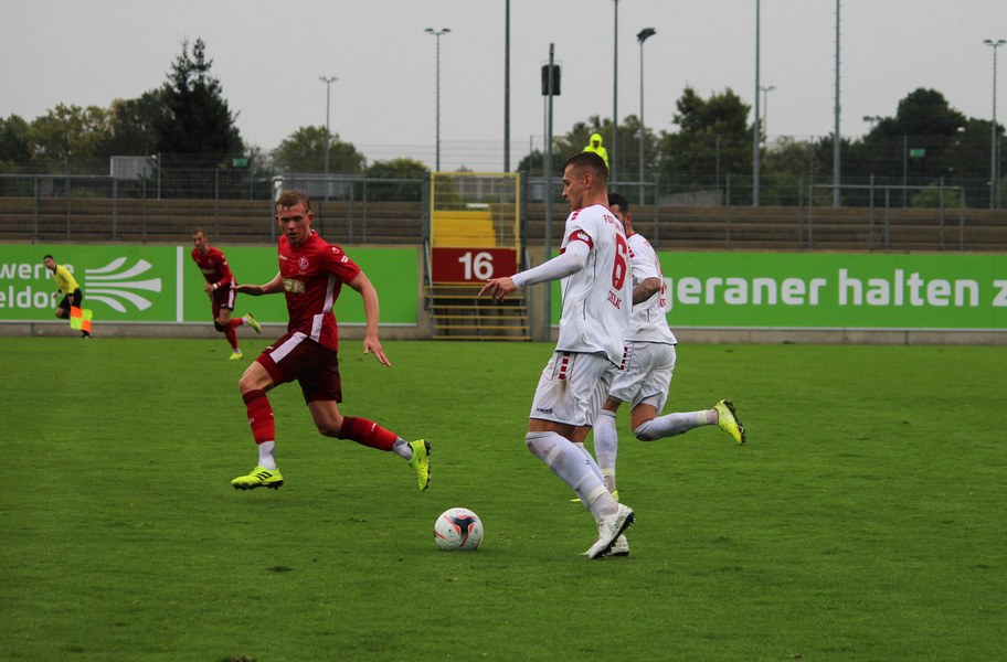 Zum Abschluss der englischen Woche ging es für Fortuna Köln zur U 23 von Fortuna Düsseldorf. In der verregneten Landeshauptstadt setzte Trainer Thomas Stratos auf die selbe Startelf, die am Mittwoch den Weg zum zweiten Saisonsieg ebnete. Doch kaum waren elf Minuten gespielt, da sah sich diese Elf bereits im Rückstand. Kevin Hagemann tankte sich über die rechte Angriffsseite in den Strafraum und hatte den Blick für den besser platzierten Appelkamp, der den zurückgelegten Ball zur frühen Führung der Gastgeber einschob (11.). Nur zwei Minuten später versuchte es der Torschütze aus der Distanz, zog seinen Schuss aber knapp über die Latte. Die Südstädter zeigten sich etwas beeindruckt von der Führung der Gastgeber und wartete weiter auf die schnellen Umschaltmomente. So wurde Koljic über die rechte Seite geschickt und brachte seine Flanke auf den ersten Pfosten, wo Düsseldorf vor Roman Prokoph klärte. Der getretene Eckball von Salman landete anschließend auf dem Kasten der Gastgeber (16.). Auch Ochojski hatte mit seinem Schuss aus der Distanz keinen Erfolg. Okoye hatte im ersten Versuch zwar Probleme, den Ball vor dem herbeieilenden Prokoph dann aber sicher. Die Kölner schüttelten sich und kamen immer besser in die Partie. Vor allem Aktivposten Mike Owusu leitete immer wieder gefährliche Situationen ein. Erst landete der Ball nach Owusu-Flanke bei Dennis Brock, der mit seinem Volleyabschluss an einem Düsseldorfer Rücken scheiterte (28.), dann bewies er einen feinen Fuß und bereitete den Ausgleich durch Salman vor. Owusu steckte auf Fortunas Nummer 10 durch, der den Ball trocken zum Ausgleich einschob (34.). Kurz vor der Pause gab es dann noch einen kurzen Schreckmoment für die Fortuna aus Köln. Appelkamp stand völlig blank an der Kante des Sechzehners und zog den Ball auf das Tor. Der Pfosten rettete für Rauhut, der dem Ball nur noch hinterherschauen konnte. Damit ging es mit dem Unentschieden in die Pause. Fortuna war wieder im Spiel.