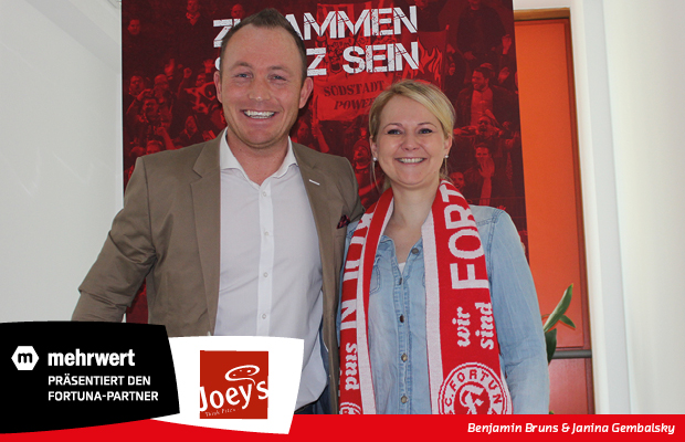 „Joey‘s ist eine Marke mit Kultcharakter und zählt zu den Marktführern bei den Pizza-Lieferdiensten. Kult und Leistung sind Werte, die wir bei der Fortuna lebendig werden lassen wollen. Von daher freuen wir uns über die Partnerschaft mit Frau Gembalsky und wollen Joey‘s Pizzen auch in der Südstadt etablieren“, beschreibt Benjamin Bruns, Leiter Sponsoring/Vertrieb, die Zielsetzung der Partnerschaft. „Die Mannschaft von Fortuna Köln beweist vor allem eines: Power. Der Zusammenhalt der Mannschaft und der Fans ist außergewöhnlich und wir freuen uns, Fortuna als Partner unterstützen zu dürfen“, begründet Janina Gembalsky, Joey’s Franchise-Partnerin, die Partnerschaft.