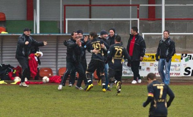 (Auch das Trainerteam und die Ersatzspieler freuen sich mit Abdelkader Maouel über dessen wunderschönes Freistoßtor, Foto: Gert König)