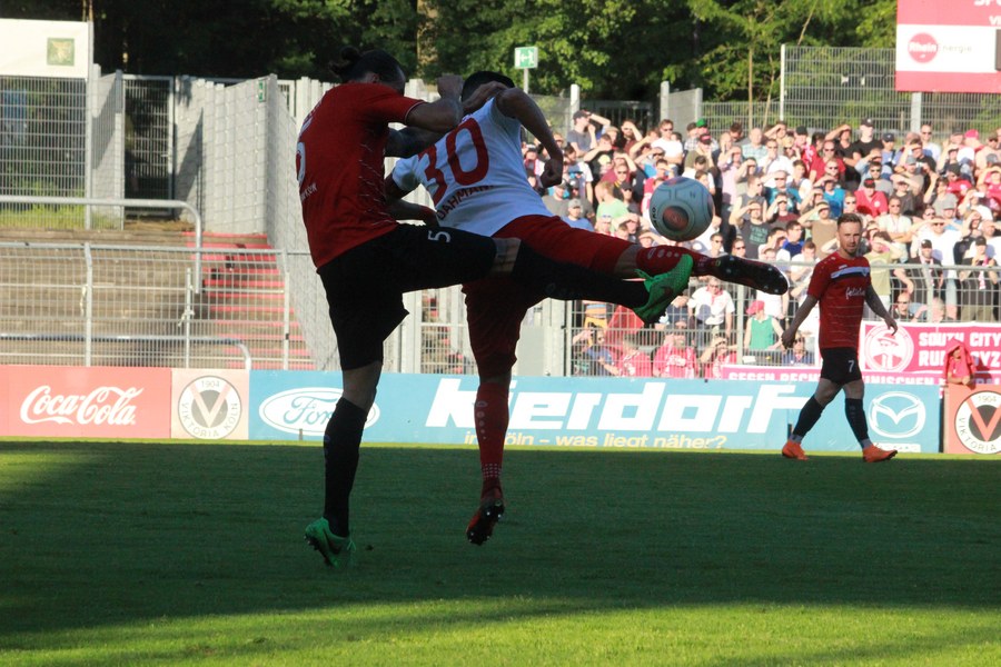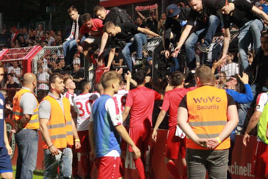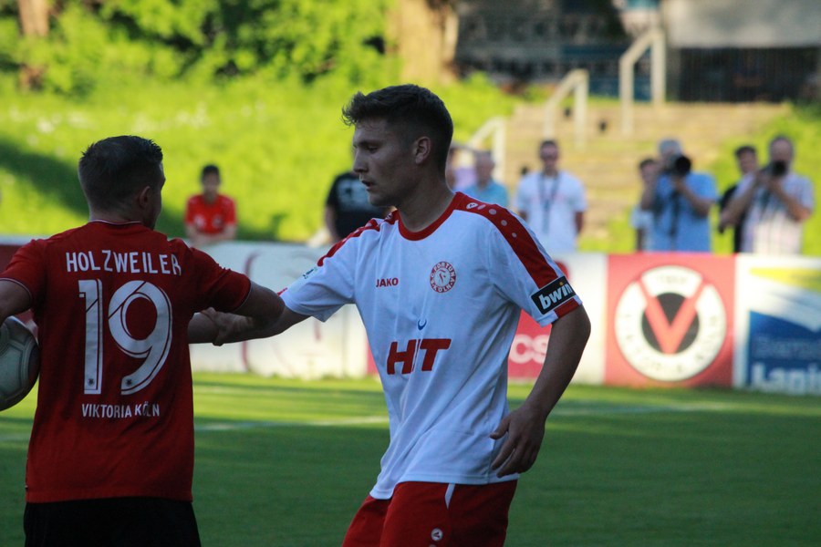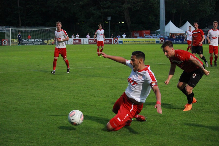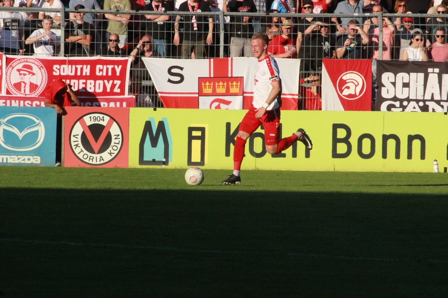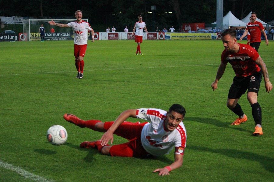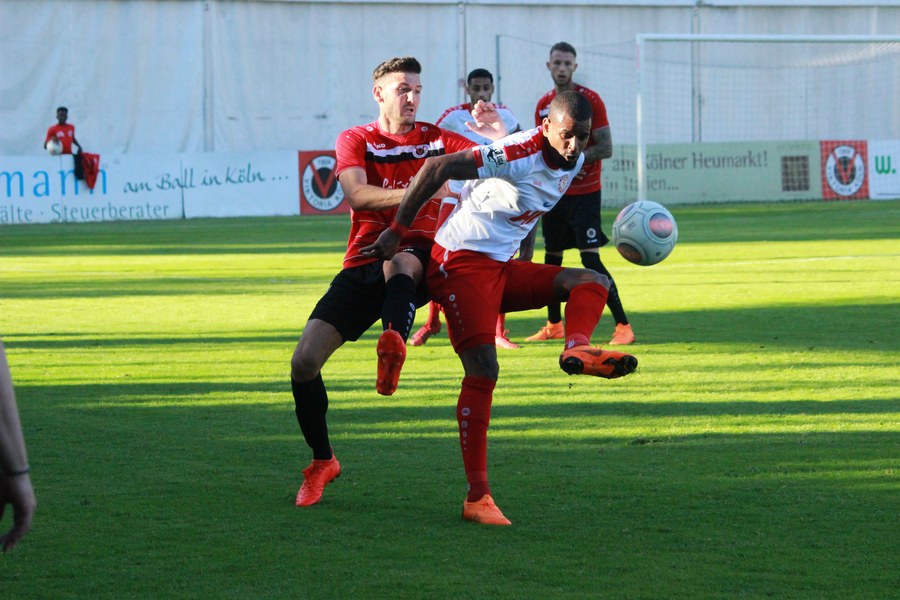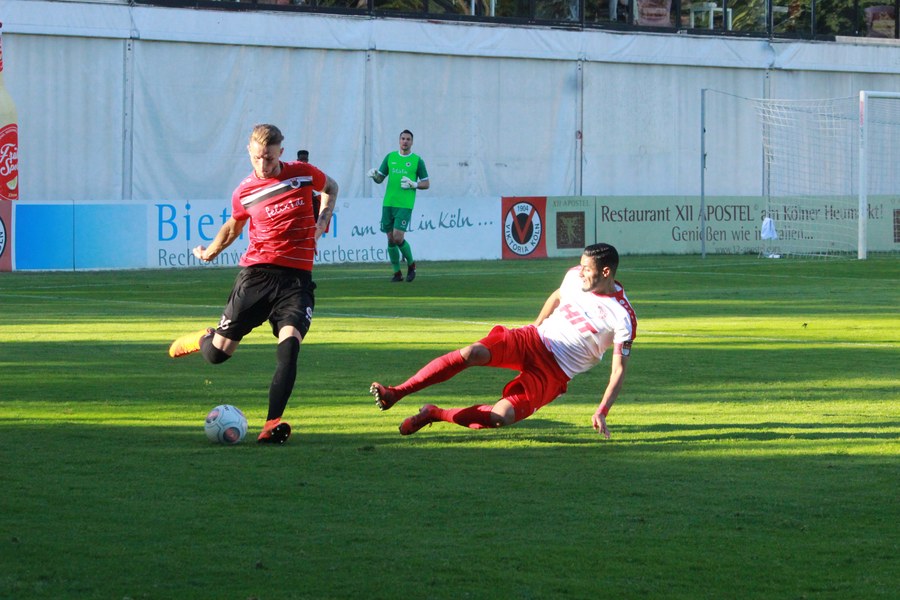 Es entwickelte sich von Beginn an ein intensives Derby im Sportpark Höhenberg. Unterstützt von zahlreichen Fans bot die Fortuna der Viktoria wenig Räume für Kombinationen. So versuchten beide Teams über Zweikämpfe und der einen oder anderen Emotion ins Spiel zu finden. Schließlich prüfte Koronkiewicz nach einer Ecke Boss das erste Mal (7.). Im Gegenzug meldete Keita-Ruel die Fortuna per Kopf nach der ersten Fortuna-Ecke an (8.). Die Fortuna schaffte es über die linke Seite dann aber mehr und mehr die Viktoria festzunageln. Die besseren Chancen hatten aber zunächst die Gastgeber mit einem sehenswerten Außenristschuss von Golley (15.). Anschließend neutralisierten sich beide Teams bis auf ein paar Distanzschüsse. Es spielte sich viel im Mittelfeld ab, ehe der Schiedsrichter Heller das Spiel belebte: So musste der bereits verwarnte Menz nach einem Handspiel an der Mittellinie mit gelb-rot vom Platz (31.). Anschließend verwehrte der Unparteiische der Fortuna einen Foulelfmeter, als Patzler außerhalb des Fünfmeterraums Brandenburger umräumte (33.). Aus dem Spiel heraus ließ Nottbeck dann gegen Boss die nächste Viktoria-Chance liegen (37.). Die Fortuna fing sich anschließend aber und schnupperte mit einem Volley von Dahmani an der Führung (45.). So blieb es aber beim 0:0 zur Pause.