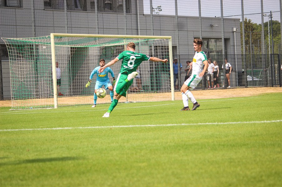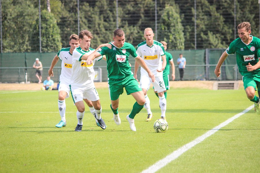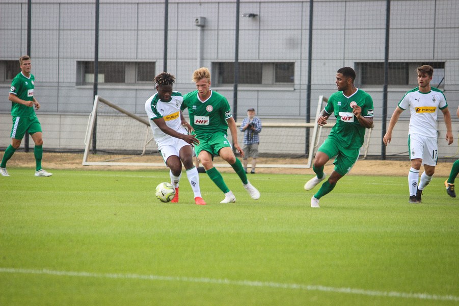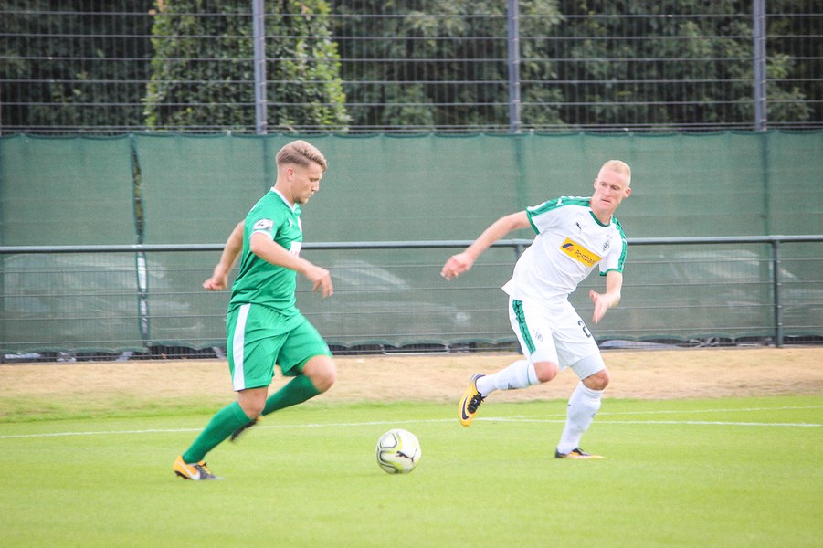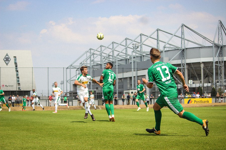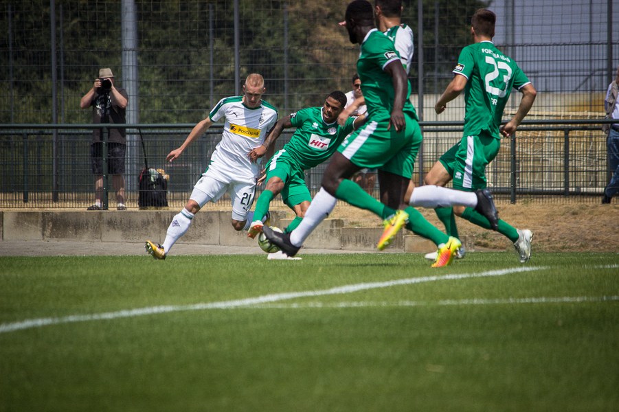 Trotz der heißen Temperaturen legten beide Mannschaften schon zu Beginn ein ambitioniertes Tempo an den Tag. So erspielten sie sich nach zehn Minuten auch immer wieder kleinere Chancen, die aber beide Seiten nicht entschlossen genug zuende spielten. Nach einer Viertelstunde konnte sich keine Mannschaft qualitativ von seinem Gegner absetzen, wodurch die Partie nach durchaus attrkativem Start etwas abflachte. Die beste Chance der Anfangsphase hatten die Gladbacher, als Kraus eine Hereingabe direkt nahm, sein Ball aber knapp über das Tor abgefälscht wurde (20.) In der Folge erspielte sich die Borussia Mitte der ersten Hälfte ein leichtes Chancenplus. Nach der kurzen Trinkpause fiel es den Spielern schwerer, wieder in die Partie zu kommen. Die Anzahl kleinerer Fouls nahm zu und die spielerische Komponente nahm etwas ab. So war es ein langer Ball auf Yeboah, der die Viererkette de Borussia überraschte und am Ende zur Führung der Fortuna führte, als Yeboah den Ball auf den im Zentrum vollstreckenden Hartmann querlegte (33.). Im Anschluss an den Treffer hatte die Fortuna zeitweise auch etwas mehr Kontrolle über das Spielgeschehen, konnte aber nicht weiter nachlegen. So ging es mit einer 1:0 Führung in die Pause.