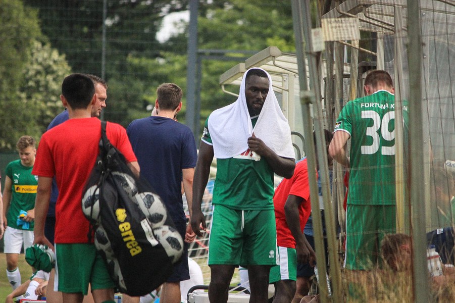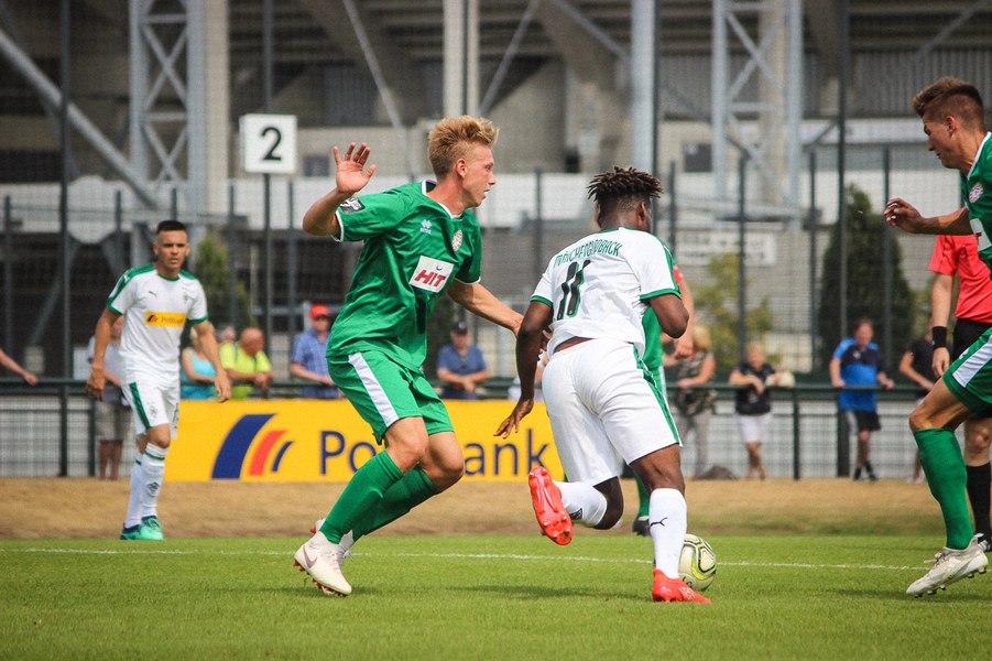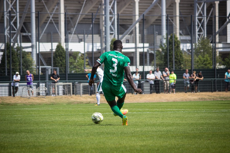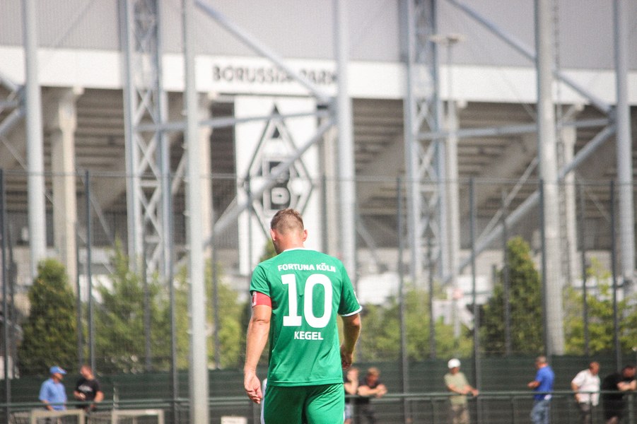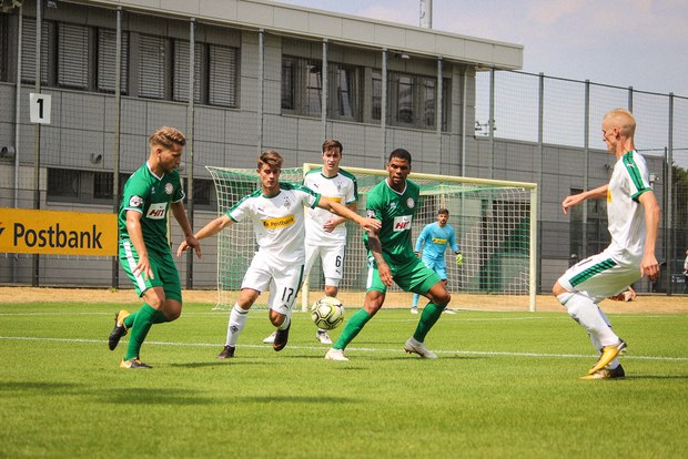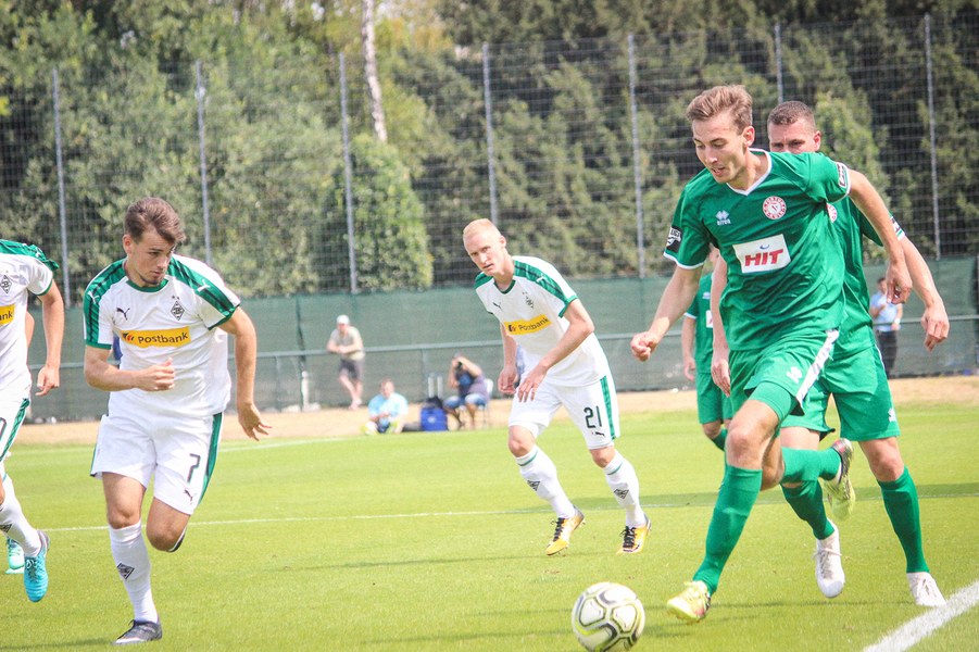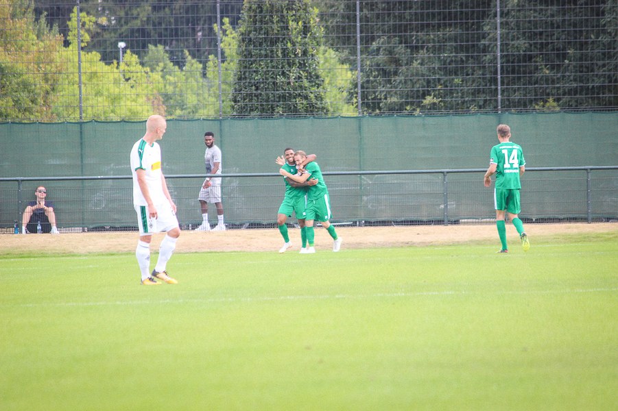 Trotz der heißen Temperaturen legten beide Mannschaften schon zu Beginn ein ambitioniertes Tempo an den Tag. So erspielten sie sich nach zehn Minuten auch immer wieder kleinere Chancen, die aber beide Seiten nicht entschlossen genug zuende spielten. Nach einer Viertelstunde konnte sich keine Mannschaft qualitativ von seinem Gegner absetzen, wodurch die Partie nach durchaus attrkativem Start etwas abflachte. Die beste Chance der Anfangsphase hatten die Gladbacher, als Kraus eine Hereingabe direkt nahm, sein Ball aber knapp über das Tor abgefälscht wurde (20.) In der Folge erspielte sich die Borussia Mitte der ersten Hälfte ein leichtes Chancenplus. Nach der kurzen Trinkpause fiel es den Spielern schwerer, wieder in die Partie zu kommen. Die Anzahl kleinerer Fouls nahm zu und die spielerische Komponente nahm etwas ab. So war es ein langer Ball auf Yeboah, der die Viererkette de Borussia überraschte und am Ende zur Führung der Fortuna führte, als Yeboah den Ball auf den im Zentrum vollstreckenden Hartmann querlegte (33.). Im Anschluss an den Treffer hatte die Fortuna zeitweise auch etwas mehr Kontrolle über das Spielgeschehen, konnte aber nicht weiter nachlegen. So ging es mit einer 1:0 Führung in die Pause.