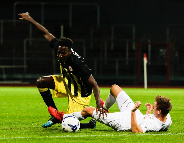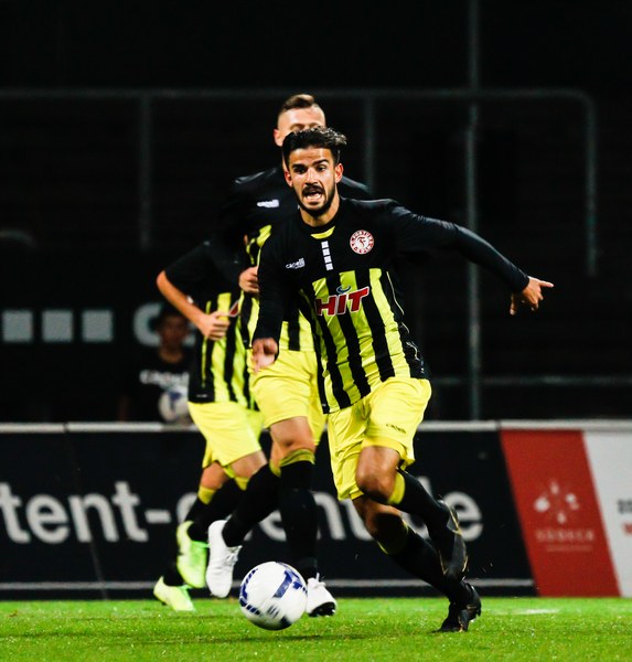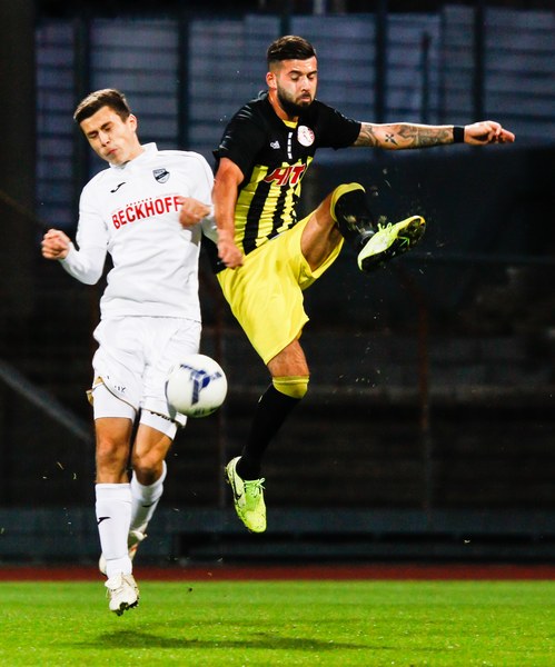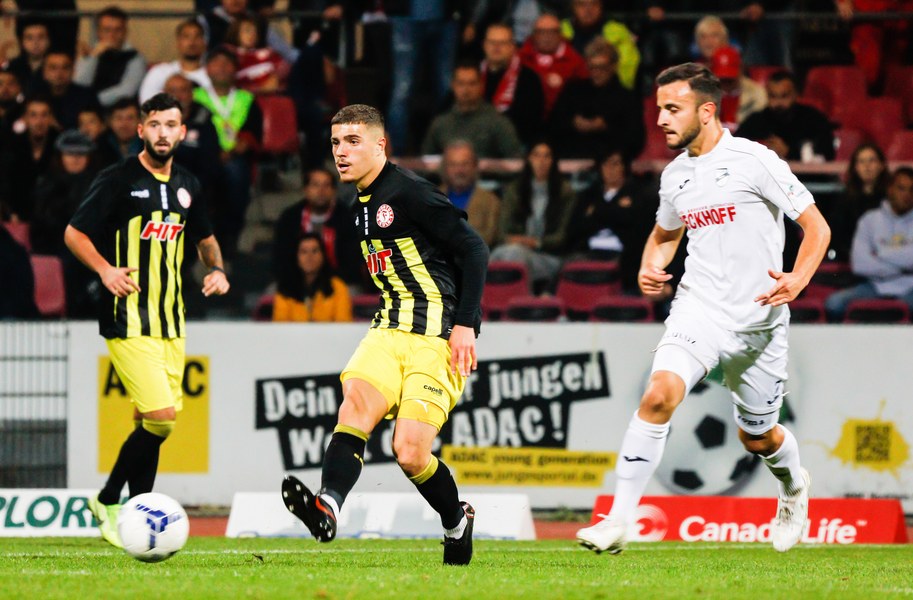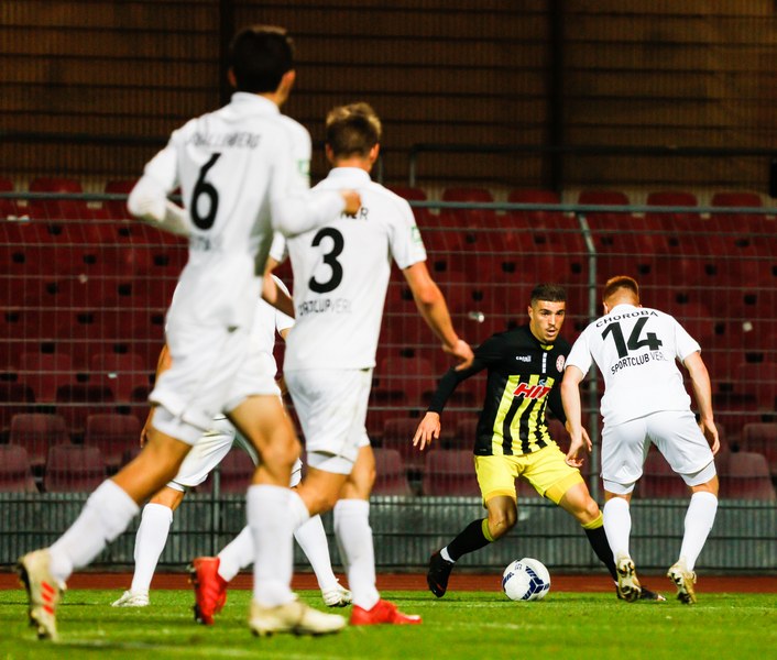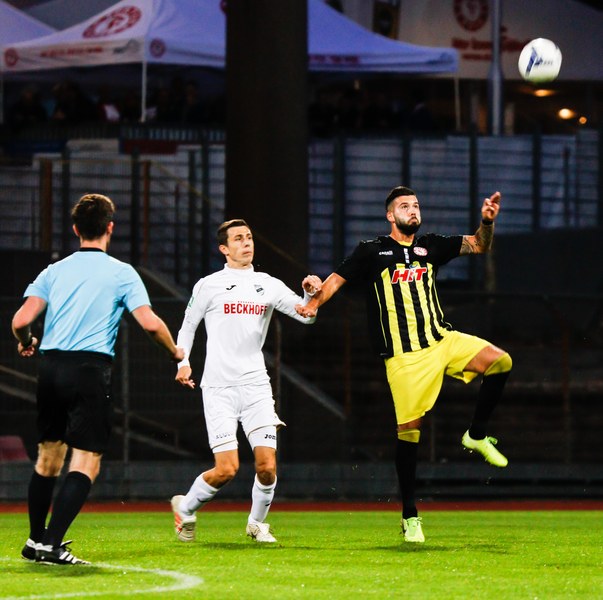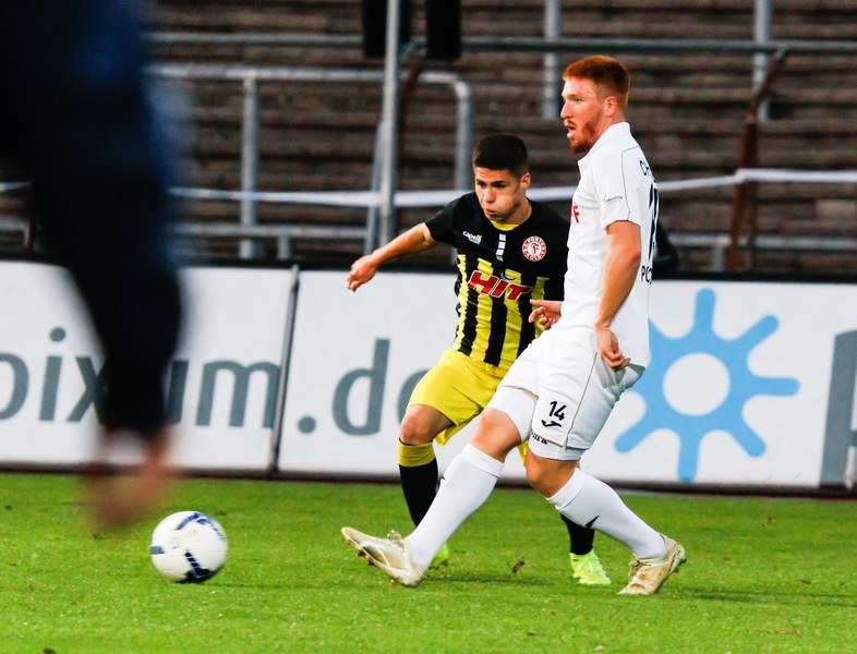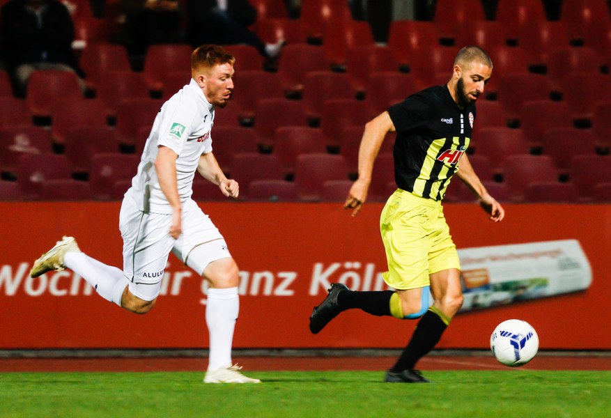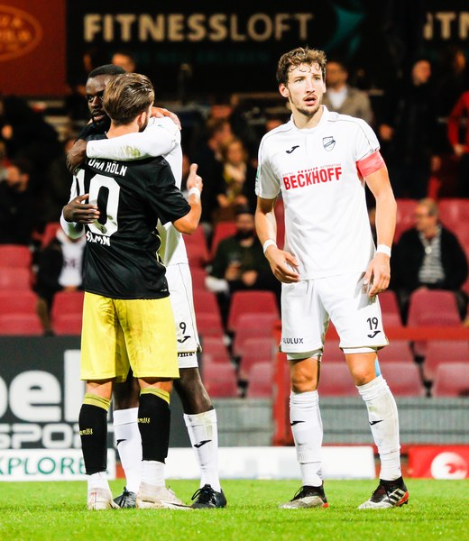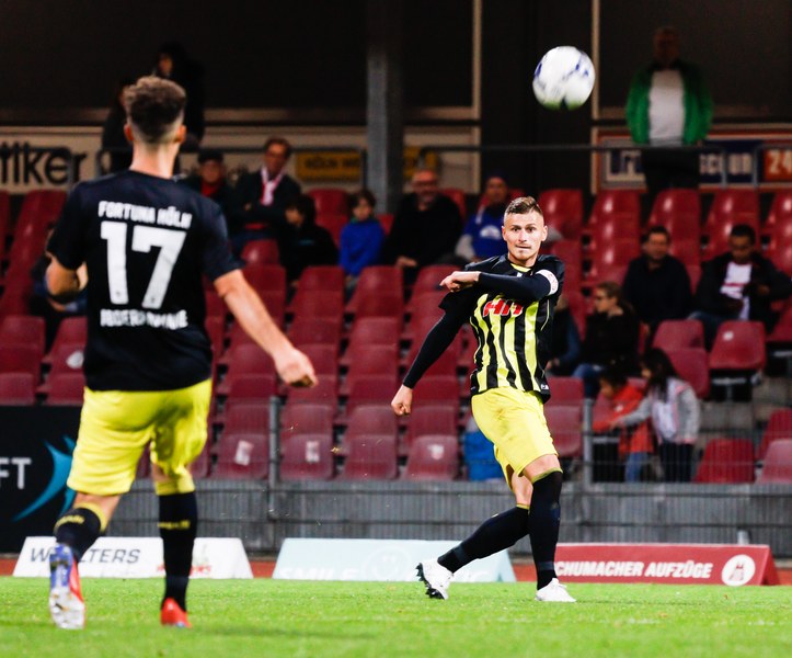 Das 4. Heimspiel der Saison im Südstadion begann mit einer Premiere. Erstmals in der Saison spielte Fortuna Köln mit dem schwarz-gelben Traditionstrikot. Die Startelf hatte Neuheiten auf zwei Positionen: Trainer Thomas Stratos brachte Roman Prokoph und Ali Ceylan für Lars Bender und Alem Koljic. Aber die Gäste fanden den besseren Start. Bereits in den ersten sechs Minuten hatten die Gegner schon zwei Ecken und einen Freistoß, und zeigten mit frühem Pressing, dass ein schweres Spiel auf die Fortuna warten würde. Für die ersten Möglichkeiten der Gäste sorgte Nico Hecker gleich doppelt. Zuerst zog er einen Schuss über das Tor (7.) dann scheiterte er an Noe Baba, der für den bereits überwundenen Rauhut auf der Linie klärte (9.). Ab der 17. Minute konnten die Kölner etwas aufatmen und den Druck von Verl besser kontrollieren. Gefährlich wurde die Fortuna dabei aber nicht, da die Versuche nicht konsequent genug zu Ende gespielt wurden. Besser machten es die Gäste auf der anderen Seite. Verl drückte weiter und traf das Tor mit einem Kopfball von Zlatko Janic (25.): 1:0 für den SC Verl. Was ein Glücksmoment für die Fortuna gewesen wäre, dauerte nur ein paar Sekunden: Die Gastgeber kamen zum vermeintlichen 1:1, aber es wurde auf Handspiel von Roman Prokoph entschieden. Dieser hatte einen gefährlichen Schuss ins Tor abgefälscht und erhielt daraufhin eine gelbe Karte (31.). Nur sechs Minuten später war es Jan Schöppener, der noch vor der Pause auf 2:0 erhöhte. Kurz vor dem Pausenpfiff startete Fortuna noch einen Versuch über die Außenbahn. Ali Ceylan versuchte, mit seinem Ball Roman Prokoph zu finden, aber seine Hereingabe geriet zu kurz (38.). So landete der Ball bei Blendi Idrizi, der aus der zweiten Reihe abzog, den Schuss jedoch über das Tor setzte (39.). Mehr gute Chance gab es nicht und so endete die erste Halbzeit.