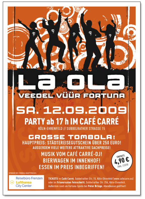 Am übernächsten Wochenende findet kein Spiel der Fortuna statt. Zeit genug also, die große LaOla-Party im Café Carré in Köln-Ehrenfeld zu besuchen. Organisiert von Fortuna-Fans für Fortuna-Fans. Der Eintritt kostet nur € 4,90 - die Tickets sind auch im Büro von deinfussballclub.de erhältlich.