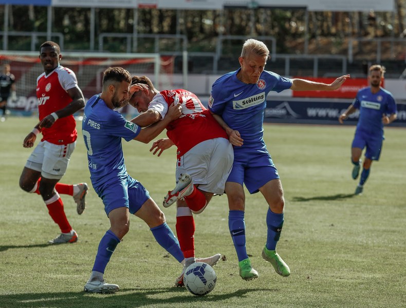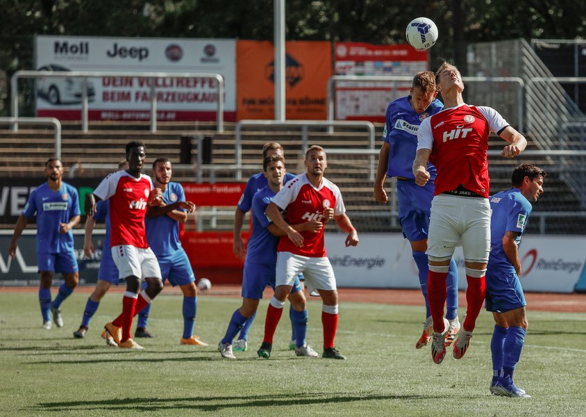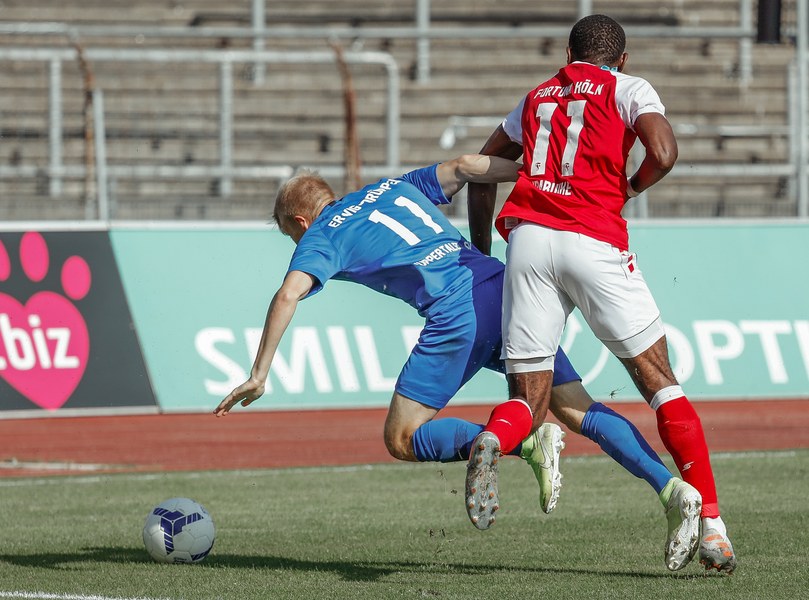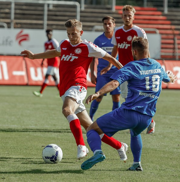 Heute stand das zweite Heimspiel unserer Fortuna an. Zu Gast war der Wuppertaler SV. Das Spiel musste leider kurzfristig und ziemlich unverhofft aufgrund der erhöhten Inzidenzzahl ohne Zuschauer stattfinden. Im Vergleich zur Startaufstellung am vergangenen Mittwoch in Homberg gab es einen Wechsel: Hamza Salman stand für Roman Prokoph auf dem Platz. Das Spiel begann direkt sehr zweikampfbetont, denn beide Mannschaften waren gewillt das Spiel für sich zu entscheiden. In der 10. Minute musste unsere Fortuna einen frühen Rückschlag hinnehmen. Lars Bender musste verletzungsbedingt den Platz verlassen und wurde durch Jean-Marie Nadjombe ersetzt. Der zweite Rückschlag folgte direkt. Nach einer gefährlichen Ecke des Wuppertaler SV, war es Marco Königs der per Kopf vollendete und den WSV mit 1:0 in Führung brachte (12.). Im direkten Gegenzug verpasste Löhden nach einer Ecke nur knapp den Ball (12.). Nach einem Einwurf war es dann erneut Löhden, der den Ball zunächst gut abschirmte und dann gefährlich vor das Tor bringen konnte - auch wenn diesen dann letztlich keiner im Tor unterbringen konnte (14.). Die Fortuna war nun besser im Spiel und setze einige gezielte Angriffe. Nach einem gegnerische Einwurf eroberte Mike Owusu erst den Ball und leitete schließlich einen gefährlichen Doppelangriff ein (18.) Doch sowohl Francis Ubabuike als auch Julian Günther-Schmidt trafen nicht zum Ausgleich. In einem sehr körperlichen Spiel pfeift der Schiedsrichter sehr genau, was zur Folge hat, dass es viele Unterbrechungen gab und der Spielfluss dadurch ein wenig gehindert wurde. In der folgenden Phase kam es dadurch nicht wirklich zu gefährlichen Chancen. In der 29. Minute traf Mike Owusu nach einem gut gespielten Konter nur den gegnerischen Keeper. Kevin Rauhut war es in der 31. Minute, der bärenstark gegen den gegnerischen Gianluca Marzullo parierte. Im Gegenzug konterte die Fortuna durch einen wichtigen Ballgewinn im Mittelfeld von Julian Günther-Schmidt, der auf den im Abseits stehenden Ubabuike durchsteckte (31.). Dieser war mit der Abseitsentscheidung nicht einverstanden und sah im Anschluss die gelbe Karte. Nach einer gefährlichen Ecke von Francis Ubabuike kam Brandenburger fast frei zum Kopfball, doch der Keeper parierte gut (36.). In der 41. Minute prüfte Günther-Schmidt den Keeper Lübcke aus der Distanz, aber die Nummer 1 der Wuppertaler war hellwach. Knapp eine Minute später brachte der eingewechselte Nadjombe den Ball per Flanke vor das Tor, aber auch hier passte der Keeper auf und fingt den Ball ab. Kurz vor der Pause hieß es dann Durchatmen für die Fortuna. Eine von Ubabuikes zahlreichen Ecken wurde in der ersten Minute der Nachspielzeit von Jannik Löhden per Fuß vollendet und führte zum verdienten Ausgleich kurz vor der Halbzeitpause (45+1.).