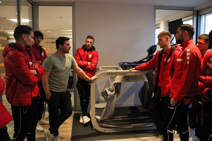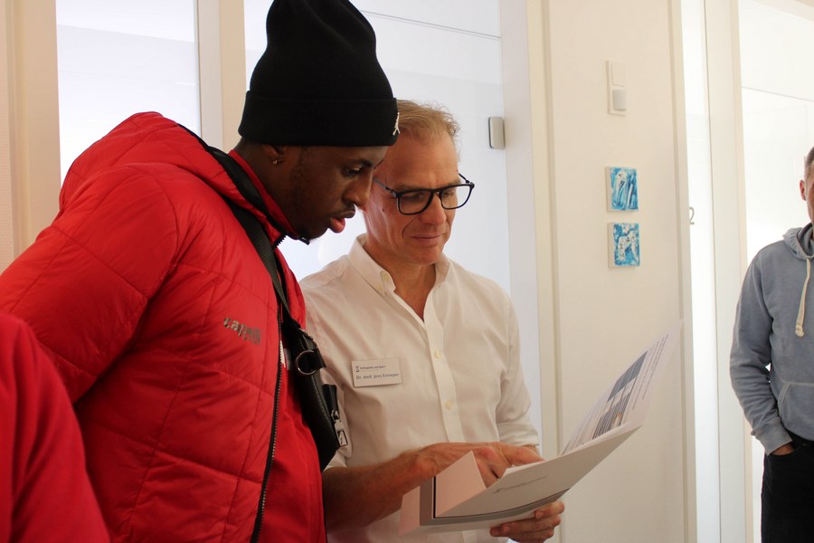 Los ging die Ärzte-Tour der Fortuna am Südstadion. Mit dem Mannschaftsbus hieß der erste Halt Jungersdorf. Trainerteam und Mannschaft besuchten dort die Räumlichkeiten von Dr. Jens Enneper und seiner Praxis Othopädie und Sport. Dr. Jens Enneper gründete die Praxis 2010 und gab mit der Nähe zur Deutschen Sporthochschule gleich die Richtung an, in die es gehen sollte. Mit seinem Team deckt er das gesamte othopädische Leistungsspektrum ab und richtet den Blick auf den sportmedizinischen Schwerpunkt. Als Teil des Teams hinter dem Team stellt er die Diagnose und leitet weitere Schritte der Behandlung ein.